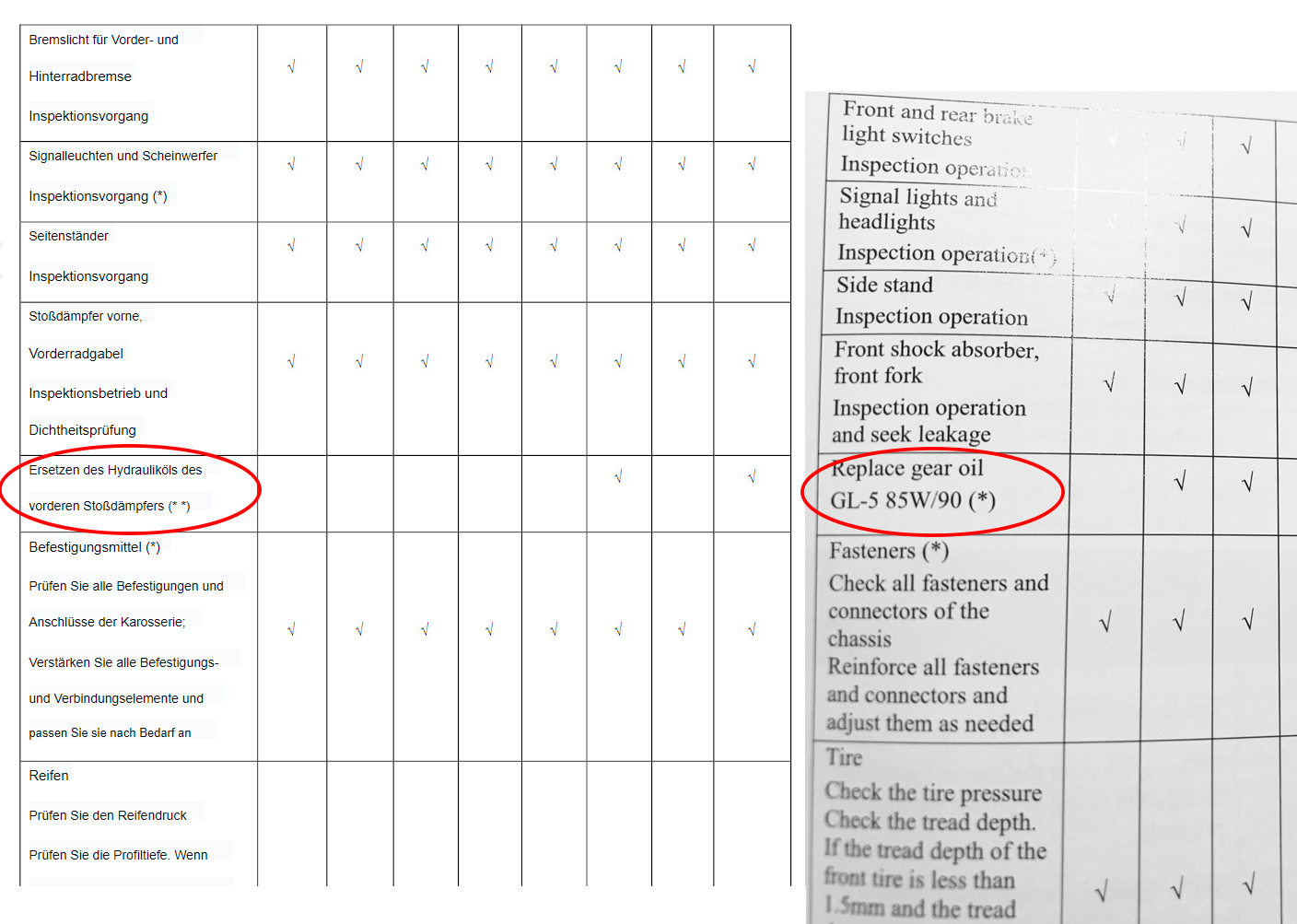 Abgesehen davon, dass ich diesen Abstand für sehr gering halte (bei diesem Wetter tritt ja die Zeitangabe eher VOR den Kilometern auf) habe ich festgestellt, dass laut englischer Ausgabe bei der 2. Inspektion ein Getriebeölwechsel notwendig sei, während es bei der deutschen Ausgabe an dieser Stelle um das "Ersetzen des Hydrauliköls desvorderen Stoßdämpfers" geht, das aber erst bei der 6. Inspektion.