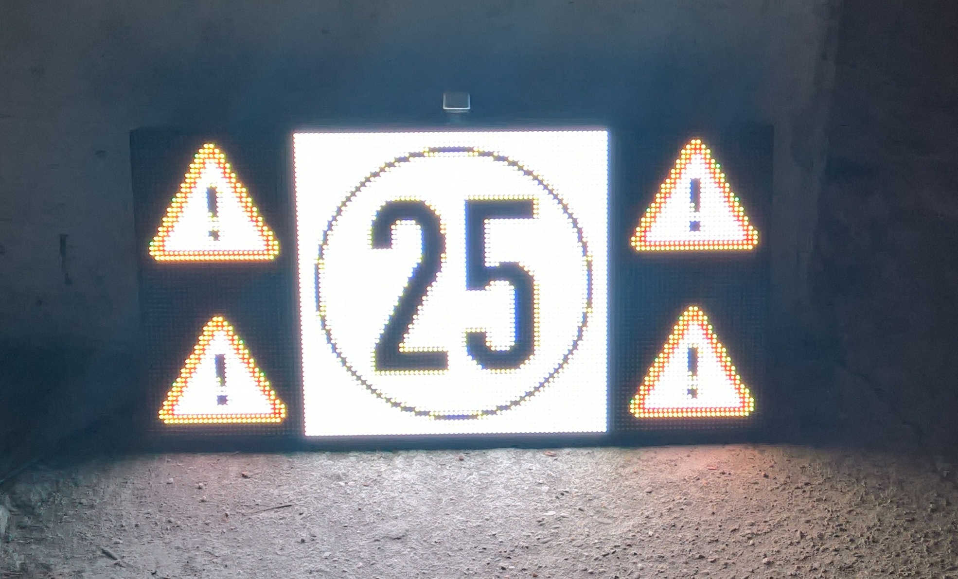 Das Display habe ich so programmiert, dass es alle 10 Sekunden abwechselnd das 25er-Schild und die Warntafel anzeigt (sie ist in echt orange, nicht weiß - liegt an der Kamera):