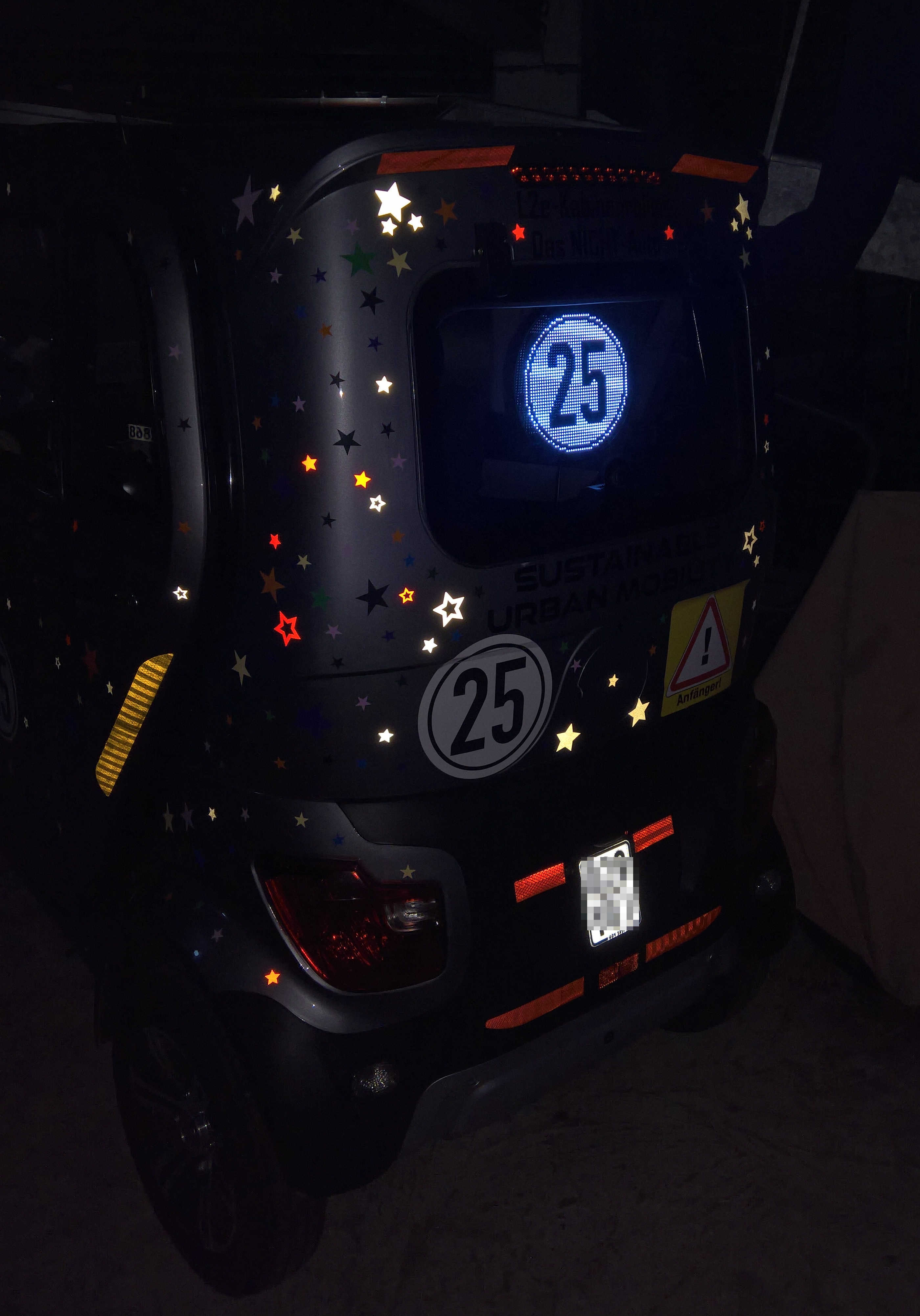 Was Du machst ist großer Unfug und du handelst dir bloß Ärger ein. Viel zu Bunt. Die Beleuchtung am Fahrzeug sollte nach vorne Weiß nach hinten Rot und zur Seite Gelb leuchten .