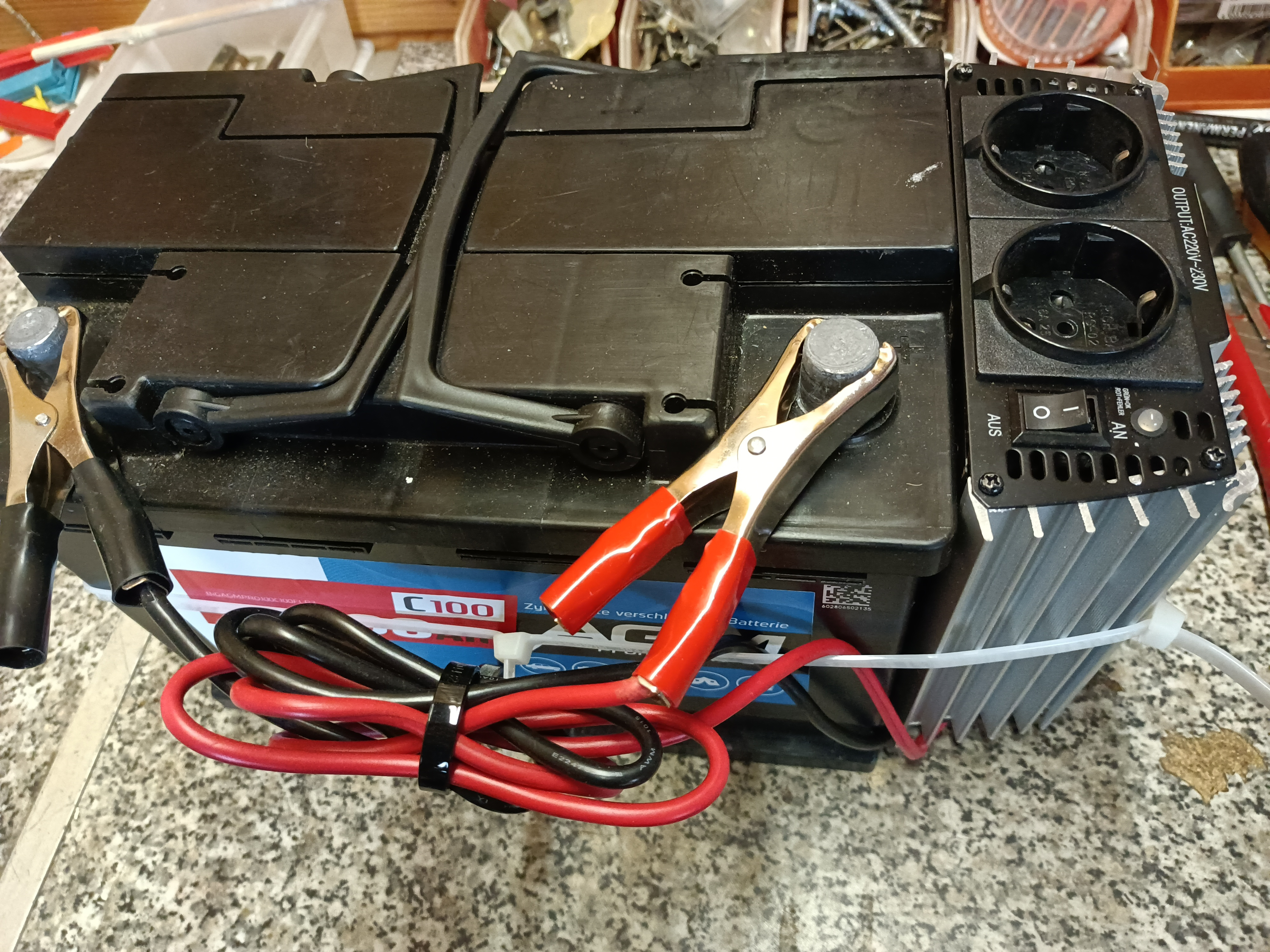 Deshalb habe ich mir eine Zusatzheizung aus einer Batterie, einem Stromwandler und einem kleinen Steckdosenheizgerät (400W) zusammengebastelt.