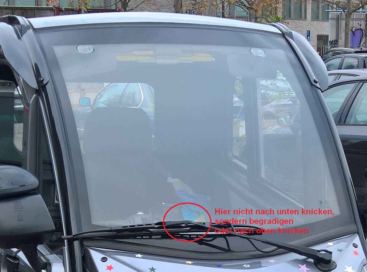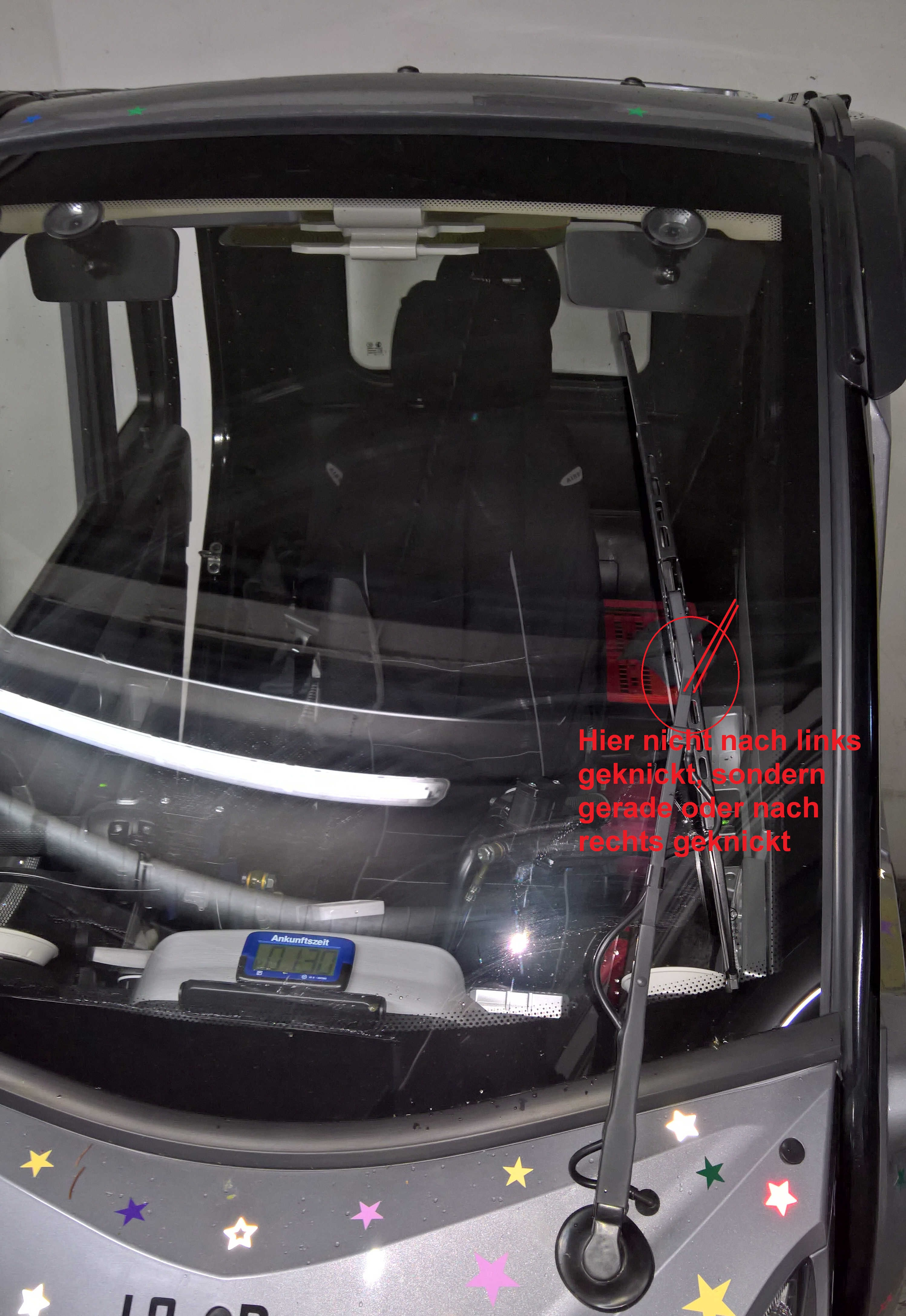 Er hat allerdings noch das originale, kurze Scheibenwischblatt. Zu unseren Fahrzeugen passen längere Scheibenwischblätter der Bosch Eco Serie. Es gibt sie in 25cm-Schritten, am günstigsten im Globus Baumarkt zu haben.