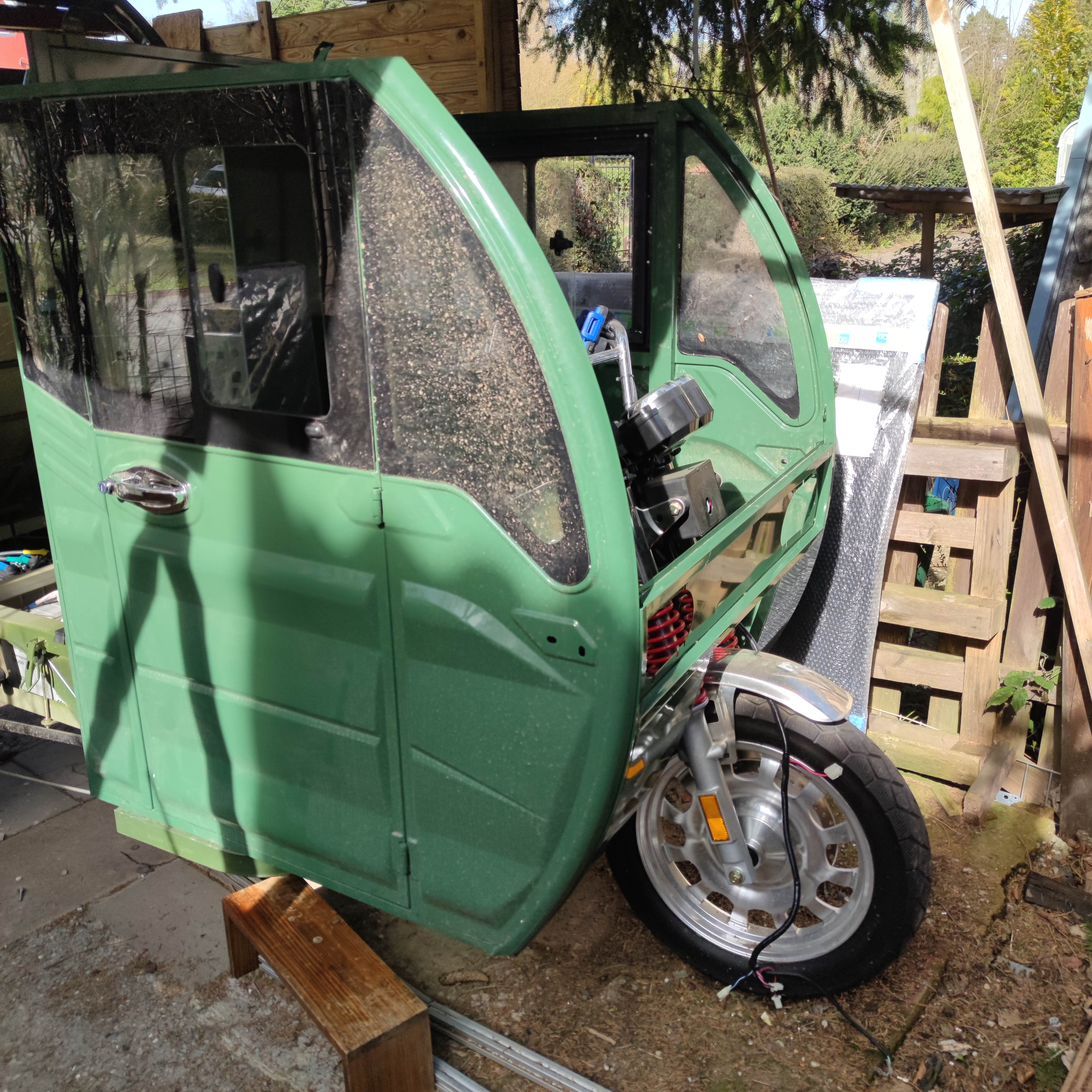 Heute die Originalhaube ohne Türen abmontiert und die neue Fahrkabine auf die ich jetzt 6 Monate aus China gewartet hab probeweise montiert .