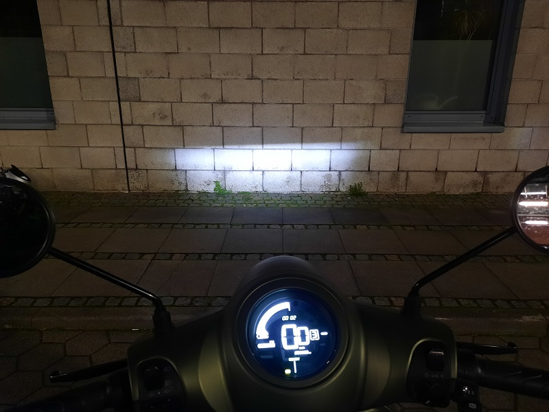 Scheinwerfer: Das Abblendlicht ist nicht sehr weit nach links und rechts, aber vielleicht ist das bei Zweirädern durch die Kurvenneigung auch gut, damit man den Gegenverkehr nicht so blenden kann.