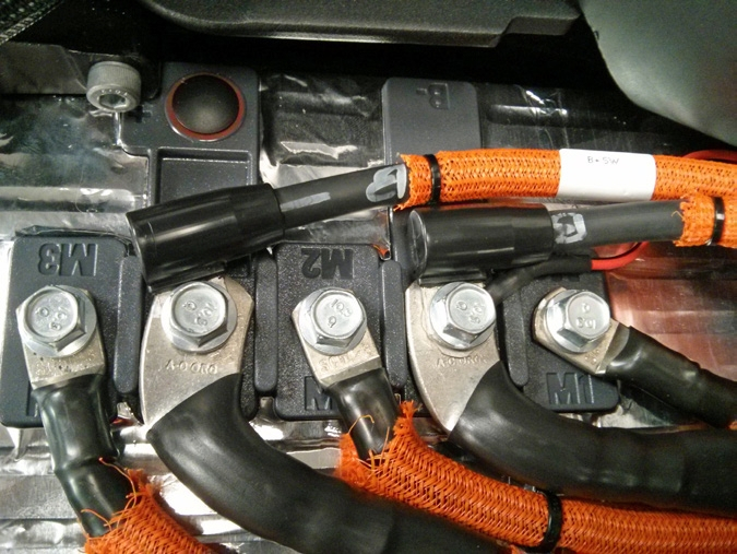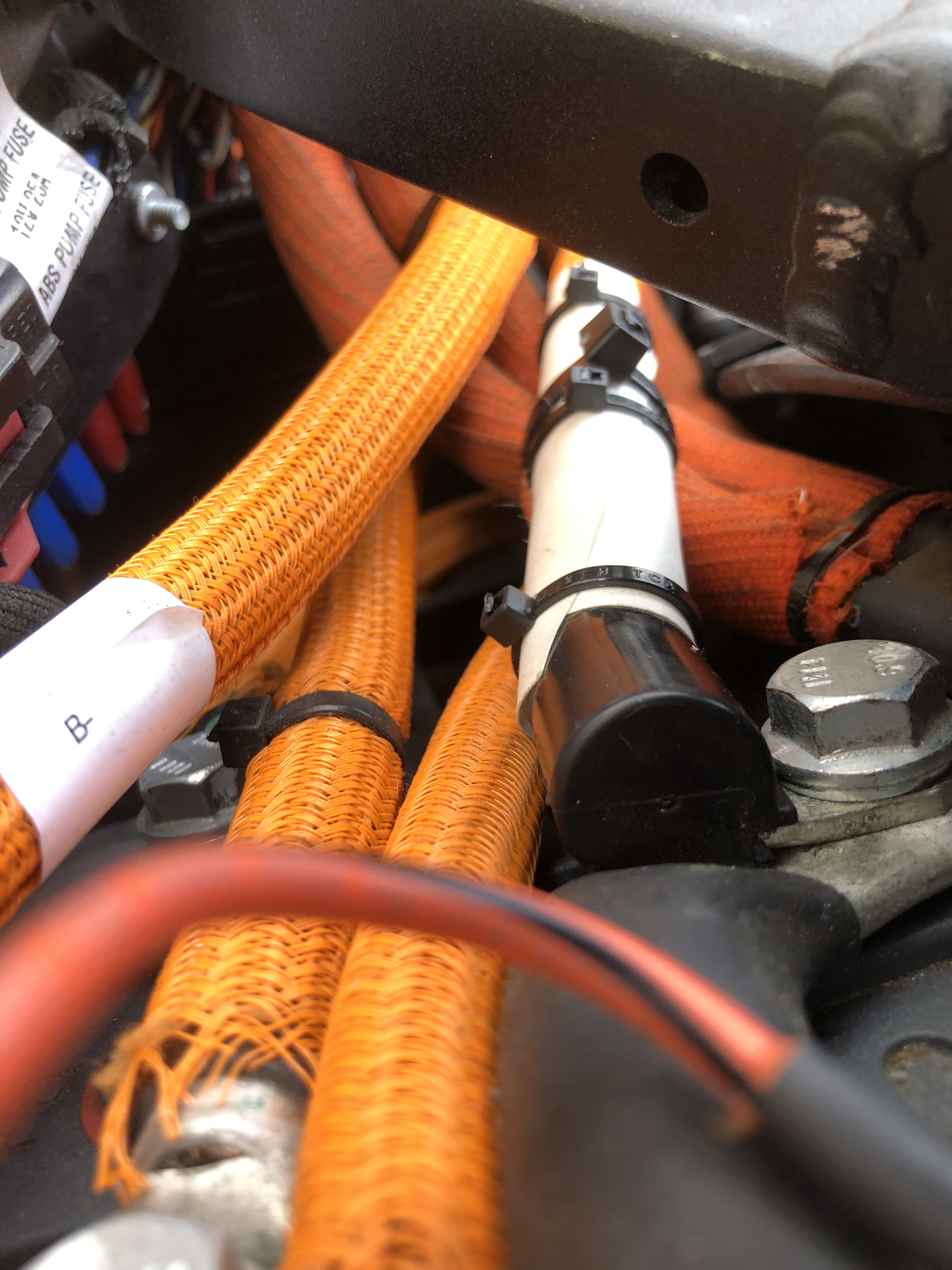 Mit einem kleinen Streifen davon habe ich also die Lücken zwischen orangenem Schutzstrumpf und Rinkabelschuh an den PowerTank-Kabeln umwickelt, mit Kabelbindern an dem Kabel selbst festgemacht, und die Kreuzungsstelle mit dem gegenpoligen Kabel von der Hauptbatterie festgezurrt, so dass keine Relativbewegung mehr zwischen den Kabeln erfolgen kann. Erst mal die Gesamtübersicht: