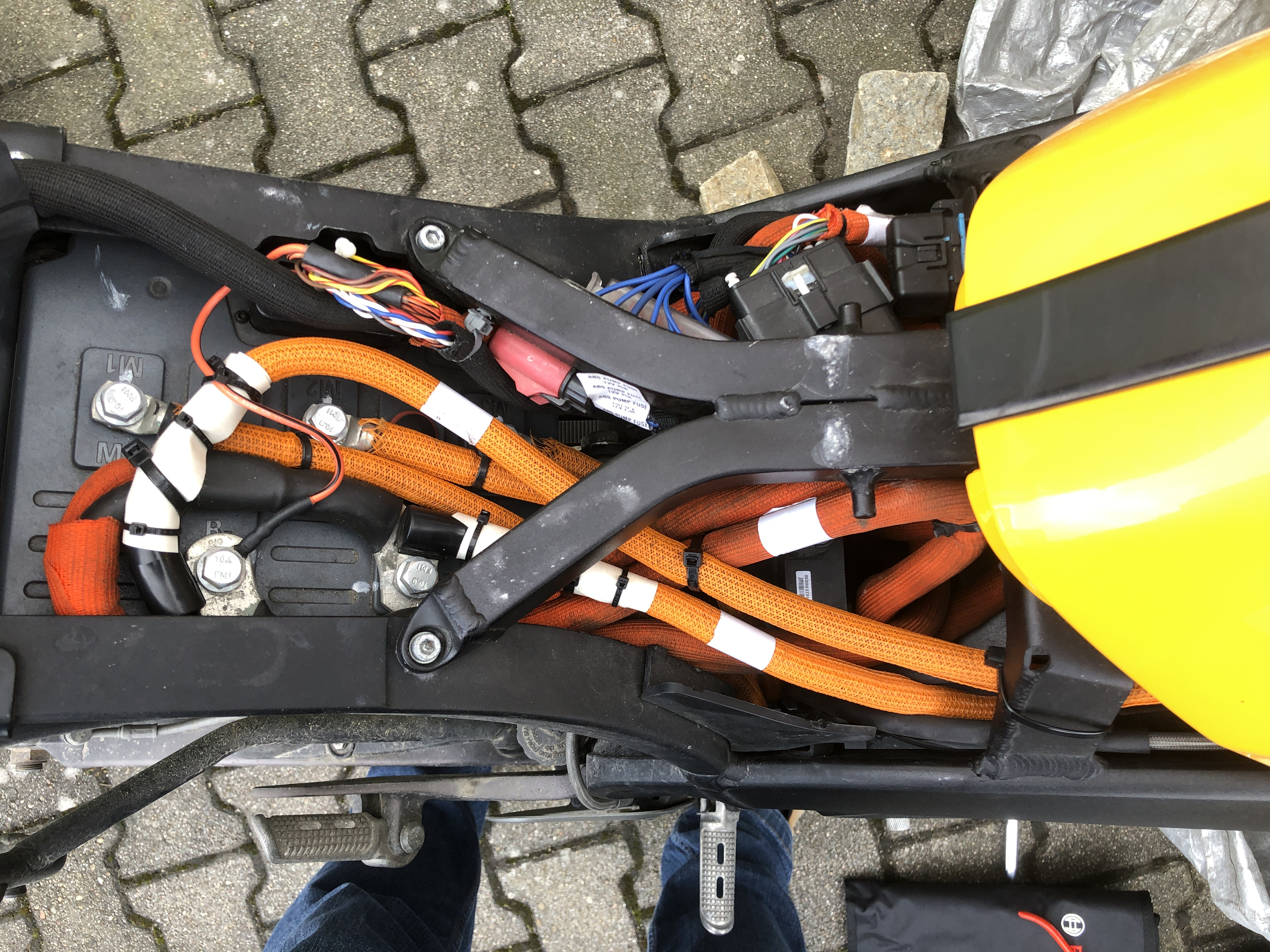 Mit einem kleinen Streifen davon habe ich also die Lücken zwischen orangenem Schutzstrumpf und Rinkabelschuh an den PowerTank-Kabeln umwickelt, mit Kabelbindern an dem Kabel selbst festgemacht, und die Kreuzungsstelle mit dem gegenpoligen Kabel von der Hauptbatterie festgezurrt, so dass keine Relativbewegung mehr zwischen den Kabeln erfolgen kann. Erst mal die Gesamtübersicht: