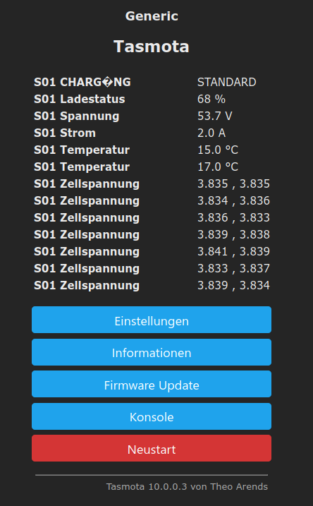 Falls der Roller beim Laden sich im Bereich des eigenen WIFI Netz befindet, ließen sich die Daten alternativ auch per mqtt aus den CAN-Bus Daten übertragen. Ich habe das selbst einmal mit einem ESP8266 zusammen mit einem MCP2515 und einem modifiziertem Tasmota Sketch ausprobiert. Die Daten wurden über mqtt in meine Smarthome Anwendung übertragen, man kann sie aber auch über das WebIF der Software auf dem Browser betrachten. Bei den Daten hatte ich mich auf die wesentlichen Werte aus dem BMS beschränkt. Auf dem Browser sieht das wie folgt aus:
