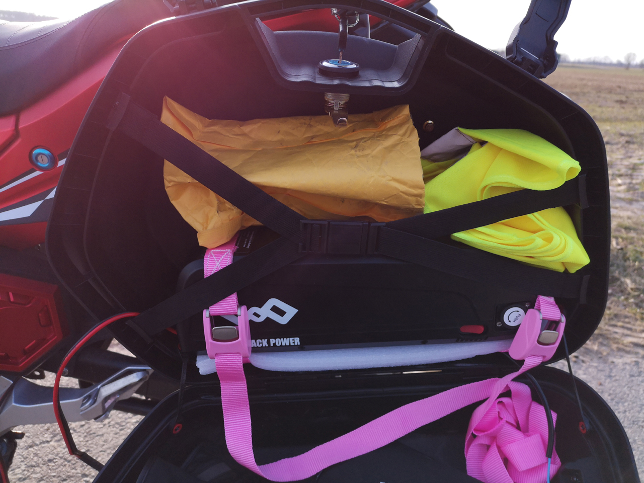 Dort habe ich dann meinen "Reservekanister" (E-Bike Akku 48V/13Ah & DC-DC Boost Converter) angeschlossen*.