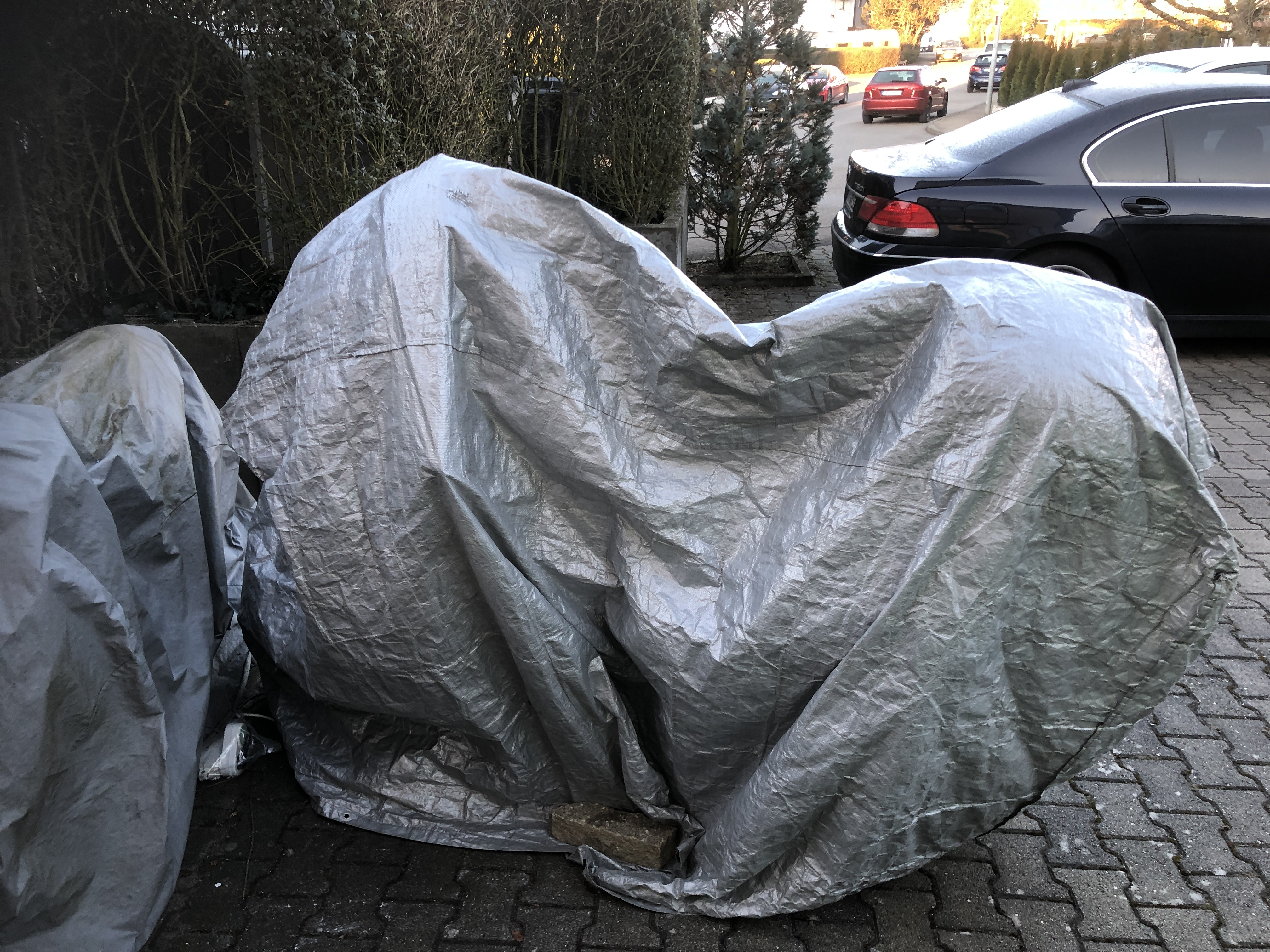 Ohne Haube bei normalem Wetter liegt die Tüte mit Inhalt dann oben auf der Sitzbank der Fury Karkasse, die sich unter der Plane am linken Bildrand verbirgt - seit Jahren schon, weil ich noch nicht weiß, wie und wo entsorgen/verschrotten, mein ehemaliges E-Pferdchen :cry: