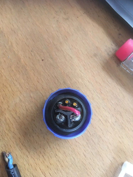 Auffällig ist eine Kabelbrücke mittels einem dünneren roten Draht die von einen der beiden Stromführenden Pole auf einen der kleineren 4 Pins geht.