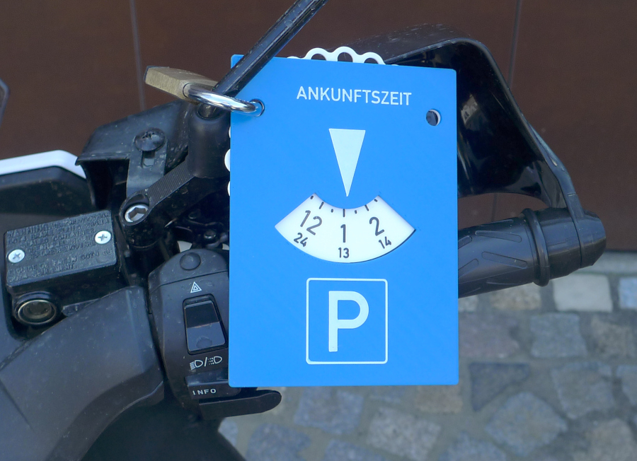 Nachdem Herr Fehse seine Parkscheibe nicht mehr produziert, habe ich mir eine gedruckt. Die Saugnäpfe habe ich weggelassen, braucht kein Mensch. Es gibt jetzt 2 Befestigunglöcher für das Vorhängeschloss (am Spiegel festmachen) und sie sind weiter vom Rand entfernt, daher haltbarer.