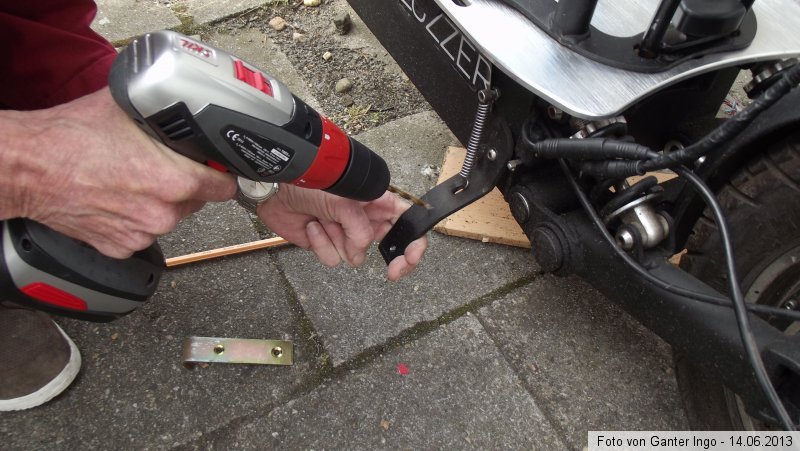 Es wurden zwei Löcher gebohrt und dann das Winkeleisen mit den zwei Schrauben und Muttern befestigt. Da das Winkeleisen ursprünglich einen Winkel von 90 Grad hat, dieses aber nicht so passt (schaut mal beim Eurem Ständer auf die Winkelkrümmung), musste die Gradzahl vorher verkleinert werden. Entsprechend wurde dieses durch meinen Verwandten angepasst.