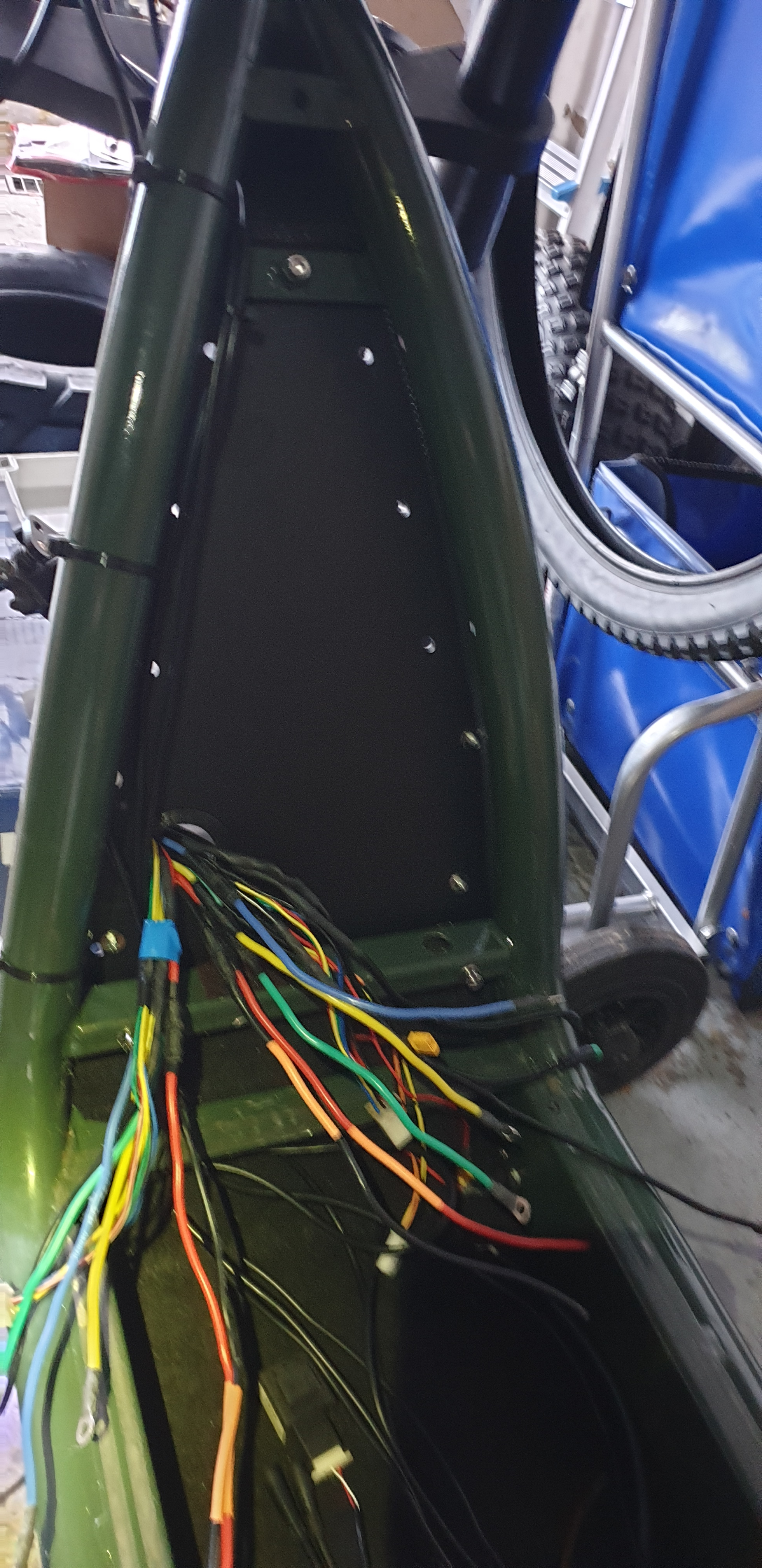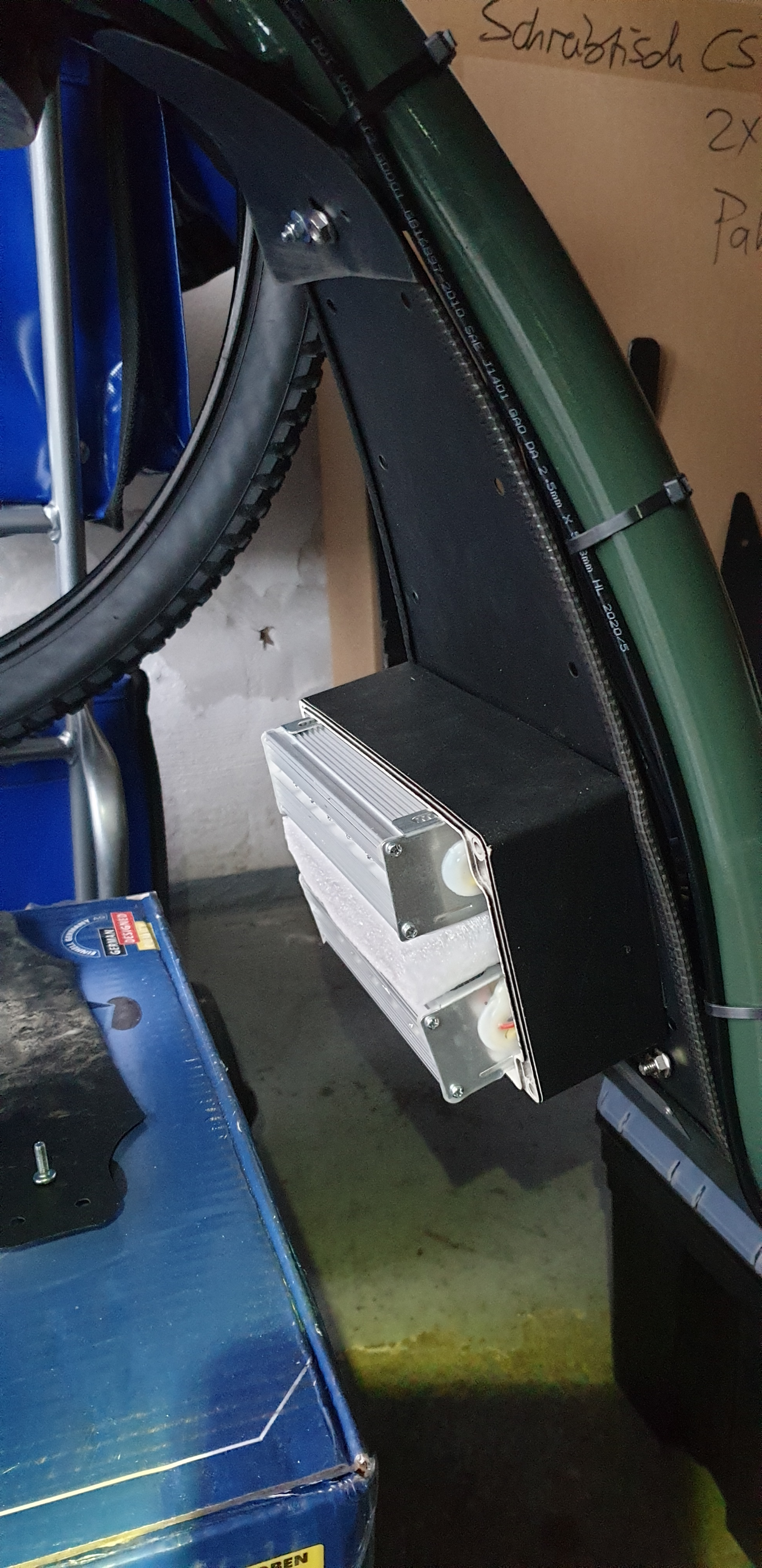 Für den zukünfitigen neuen Akku (40Ah) wurde alles vermessen, die vorhandenen Kabelstänge geprüft und teilweise erneuert, mit einer Lochsäge ins vordere Blech eine Bohrung (8cm) vorgenommen, mit einer Flex bzw. Rotationswerkszeug (Bosch) der Querverbinder aus Stahl (2mm) beidseitig ausgeschnitten. Beiden zum Zweck der späteren Kabeldurchführung. Dann wurde für das vordere Blech zur Befestigung der Controller (aussen) ein wasserfestes ABS Gehäuse in den Maßen 200x120x90mm bestellt: https://www.ebay.de/itm/403340930760, dieses in RAL 9005 (schwarz) lackiert und entsprechend angepasst: