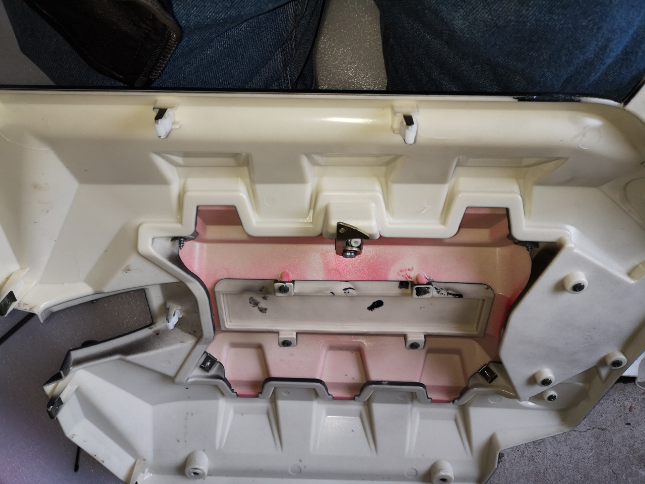 Wenn Du das Teil öffnen könntest (ist zusätzlich noch verschraubt), bekämst Du lediglich einen Blick auf die direkt darunter liegende Stahlabdeckung des Akku-Fachs.
