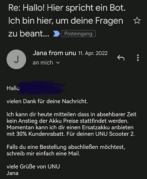 Wurde es denn zwischenzeitlich irgendwo bestätigt, dass der Preis für den Akku tatsächlich auf €1.450 (WT actual F) steigen soll? Und dann auch für Bestandskunden, die den Roller zum Vollpreis gekauft haben und sich ggf. einen zweiten oder Ersatzakku kaufen möchten? Das wäre eine völlig absurde Preissteigerung und ich kann nur unterschreiben, dass sich unu damit am Markt vollkommen ins Abseits schieben würde. Und das wäre sehr schade und als Bestandskunde auch sehr beunruhigend.