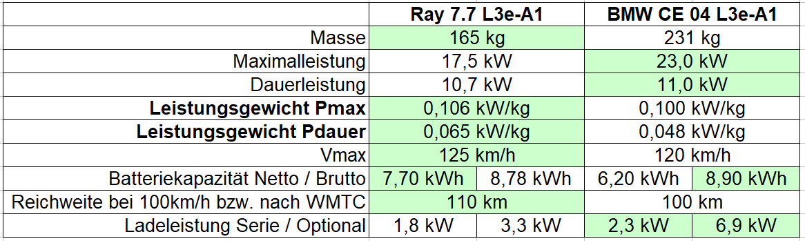 Nur um mal die Leistungsdaten zu vergleichen: grün ist der technisch jeweils günstigere Wert, und da ist gerade bei den reell nutzbaren Leistungsdaten (Leistungswicht z.B.) bei BMW nicht gerade viel grün... Bei der Ausstattung ist ganz klar der CE 04 noch King, aber bei den erlebbaren Leistungsdaten macht er sich mit seiner Fettleibigkeit das meiste kaputtFoxy87 hat geschrieben: Mo 18. Apr 2022, 18:31Ahmm, also das ist ja nicht mal leistungstechnisch annähernd in der gleichen Liga, von den anderen technischen Features gar nicht erst gesprochen (ABS, ABS pro, LED Kurvenlicht etc)