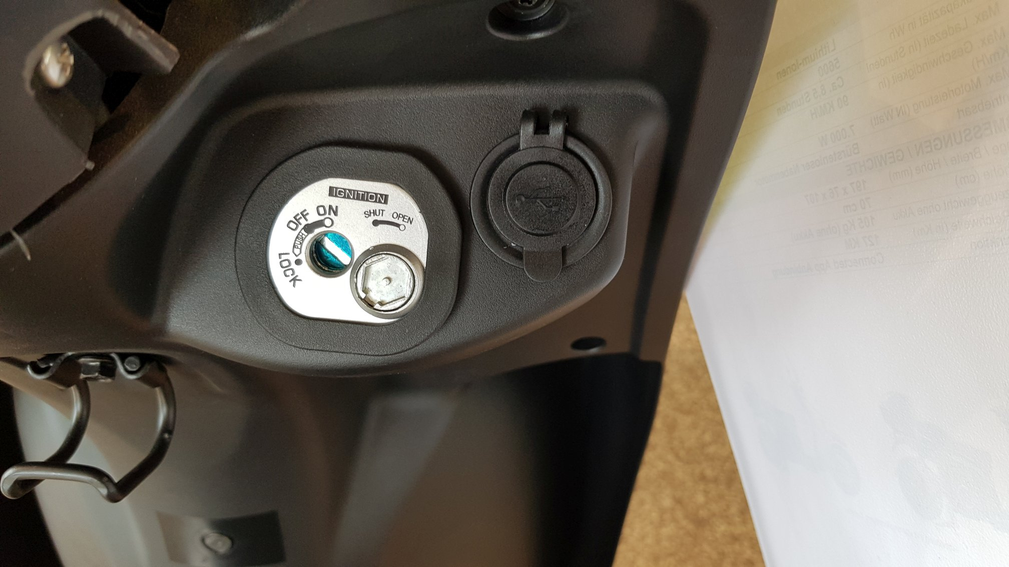 Das Handbuch für den S02 scheint vom S01 abgeschrieben: es gibt aber keine Möglichkeit, die Bank am Zündschloss zu entriegeln. Dafür braucht es das (immerhin sehr solide wirkende) Schloß unter der Bank. Ich habe blöderweise vergessen zu checken, ob der Doppelbremsgriff einen versteckten Motor in Gang setzt. Der scheint mir bei der S01 vorn zu sitzen und am gleichen Bowdenzug zu ziehen, womit die Wahrscheinlichkeit einer "Fernentriegelung" eher in weite Ferne rückt beim S02.