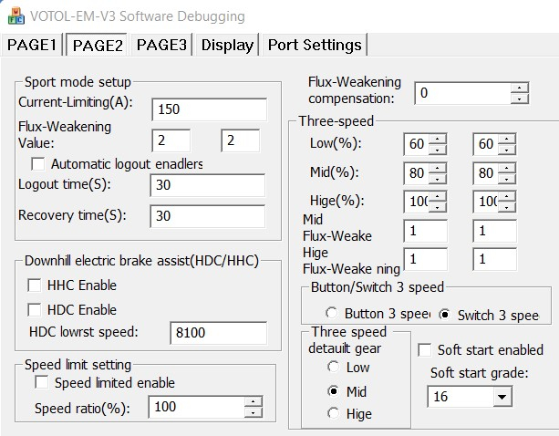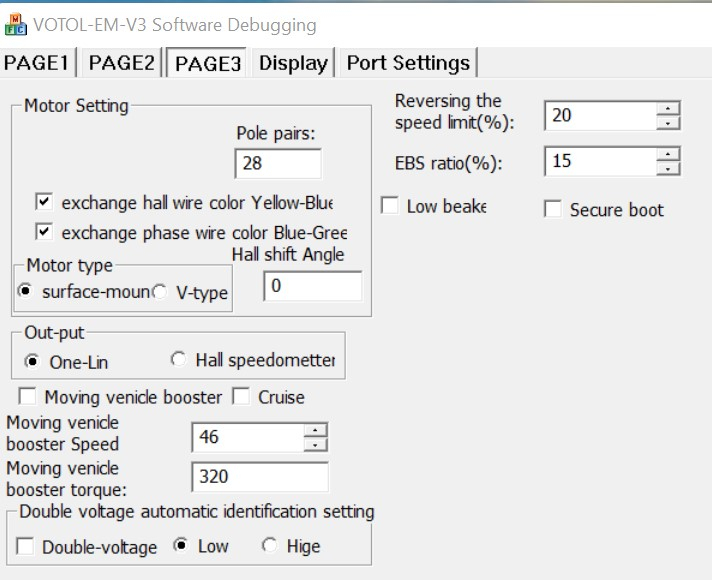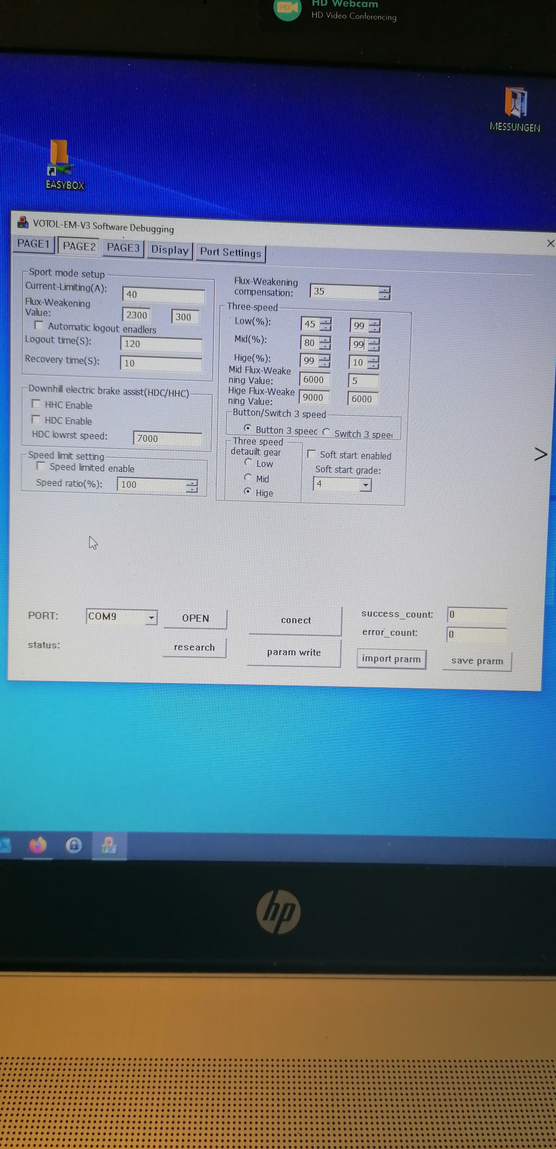 Der Motor und Roller läuft zwar (EBS hatte ich zunächst lieber ausgeschaltet) und nach Erhöhung der maximalen Spannung habe ich auch kein Problem mehr mit Overvolt durch Rekuperationseffekte beim ersten bremsen, allerdings hält die Leistung momentan nur kurze Zeit an, und dann ist offenbar ein Schleichmodus aktiv, der erst nach Neustart der Zündung weg ist.