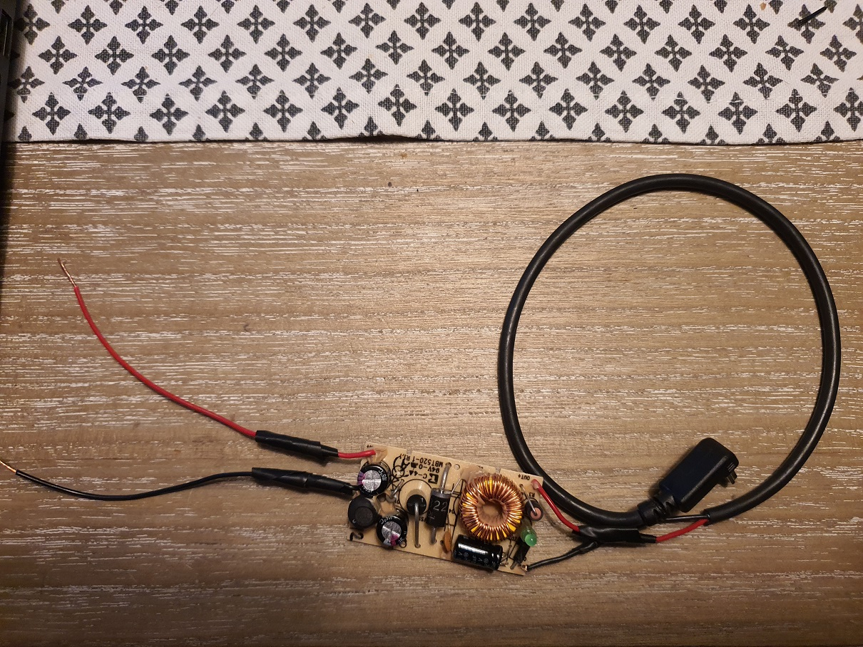 Ich bin gerade mit löten fertig geworden. Habe den Wandler aus dem Zigarettenanzünderkabel extrahiert und konfektioniert.