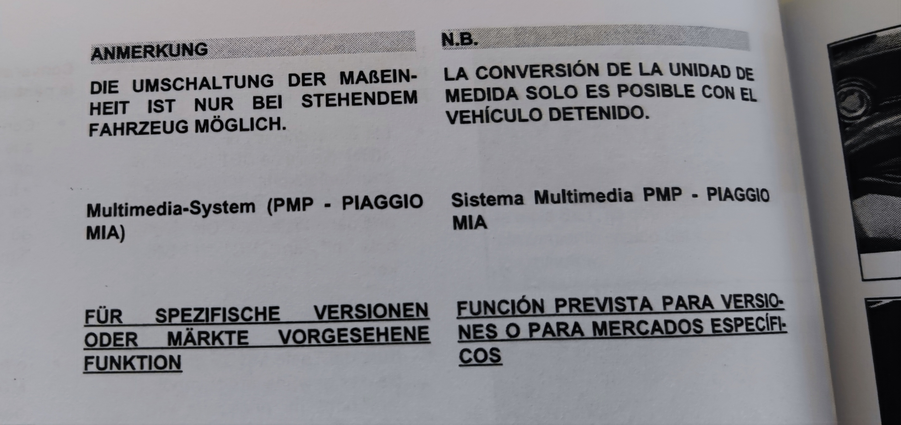 "Das Fahrzeug verfügt über das Steuergerät <<Piaggio MIA>>, das per Bluetooth mit dem Fahrzeug kommuniziert." (S.31)