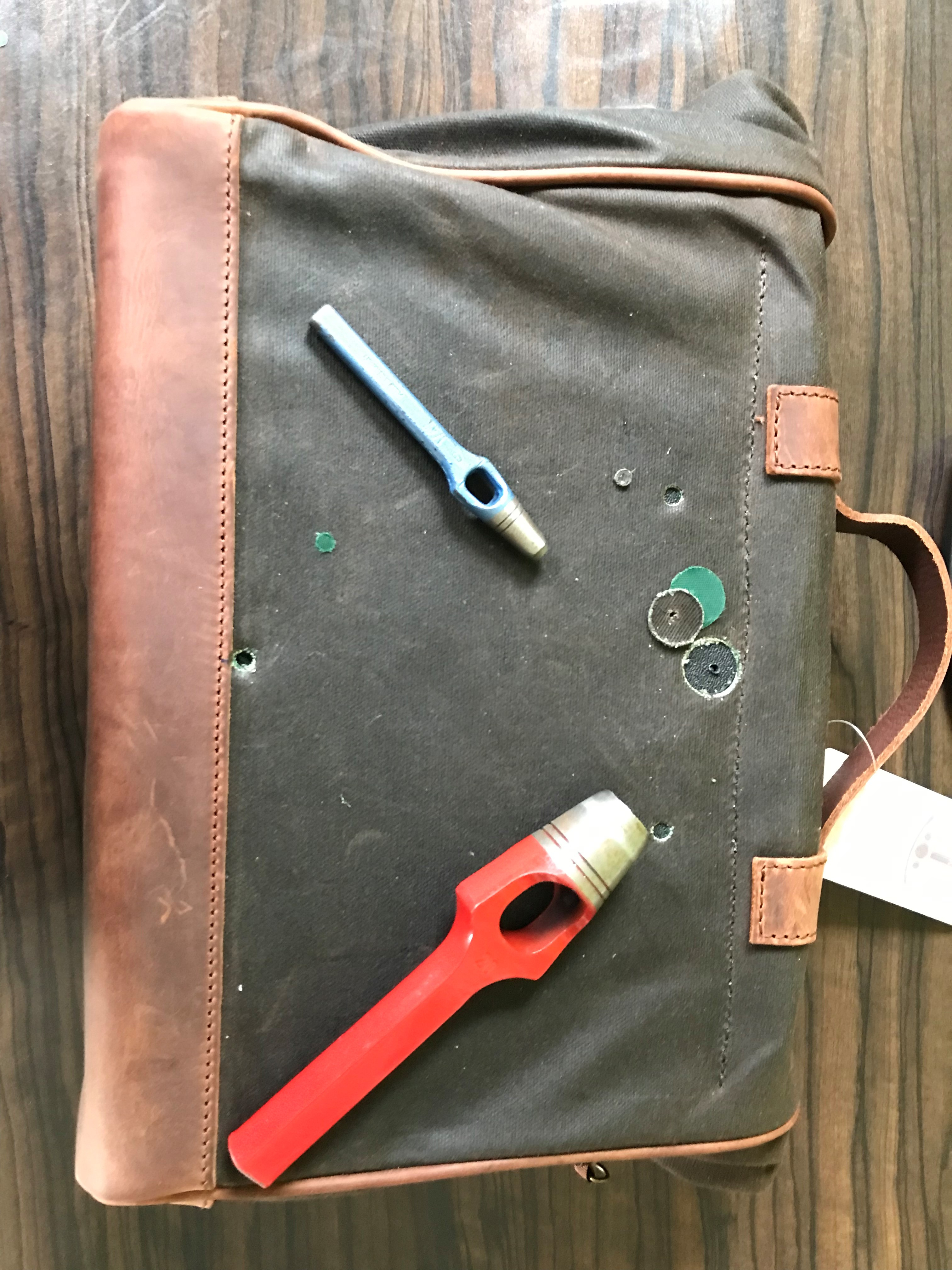 3) Geile Longride Taschen gekauft (nicht billig, aber sau gut und schön, wem's gefällt) und die Klickfix-Halterungen montiert: Erläuterung: Longride zeigt in einem Video, wie einfach durch den Stoff gebohrt wird - mit entsprechend ausgefranstem Ergebnis, Ich habe den Stoff erst sauber ausgestanzt und die Ränder abgeflammt (mit nem Creme-Brülee Brenner !). Achtung - dabei schmniltzt das Wachs im Stoff, also nicht zu lange rumwerkeln!.