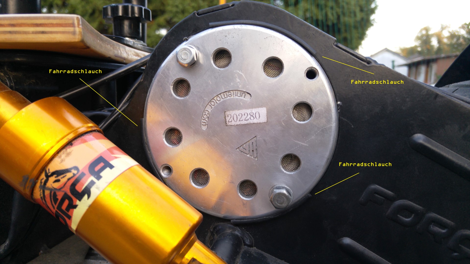 Um das Ganze zu dämpfen habe ich mir 3 Stücke aus einem Fahrradschlauch geschnitten (ca. 2x5cm). Diese habe ich etwa im Drittelabstand zwischen Motor und Rahmen soweit ging geschoben und dann mit der Zange durchgezogen. Da der Gummi sehr elastisch ist, kommt man gut durch. Der Motor ist jetzt hinten elastisch mit diesen 3 Gummipuffern im Rahmen verankert (Bilder: "Dämpfung Motor"). Ich hatte erst versucht den Gummi umlaufend auf den Motor zu kleben, aber dafür hat der Durchmesser der Öffnung nicht gereicht.