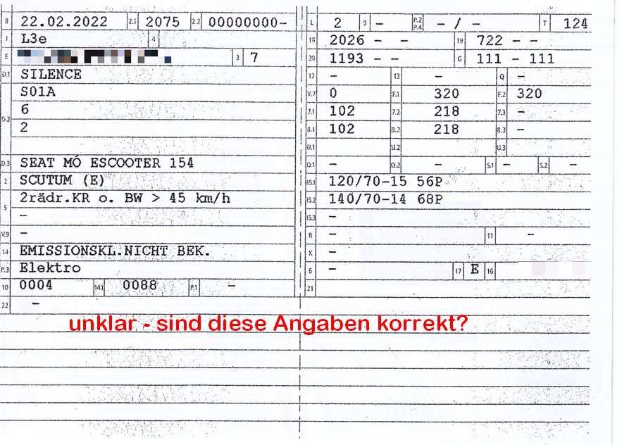 Als ich meinen zugelassen habe, war im System noch nichts zum S01 hinterlegt, und die Dame musste alles vom COC abtippen. Prompt hat sie sich auch bei irgendeiner Gewichtsangabe vertippt... Was ich aber gleich bemerkt habe.