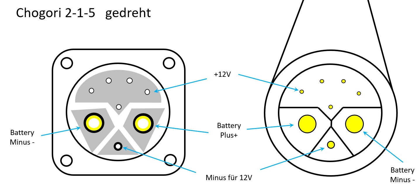 Falls es ein Chogori 2-1-5 ist, wird in der Regel diese Polarität verwendet: Vielleicht kannst Du schreiben, ob der Stecker beim 72Volt-NIU auch so aussieht?