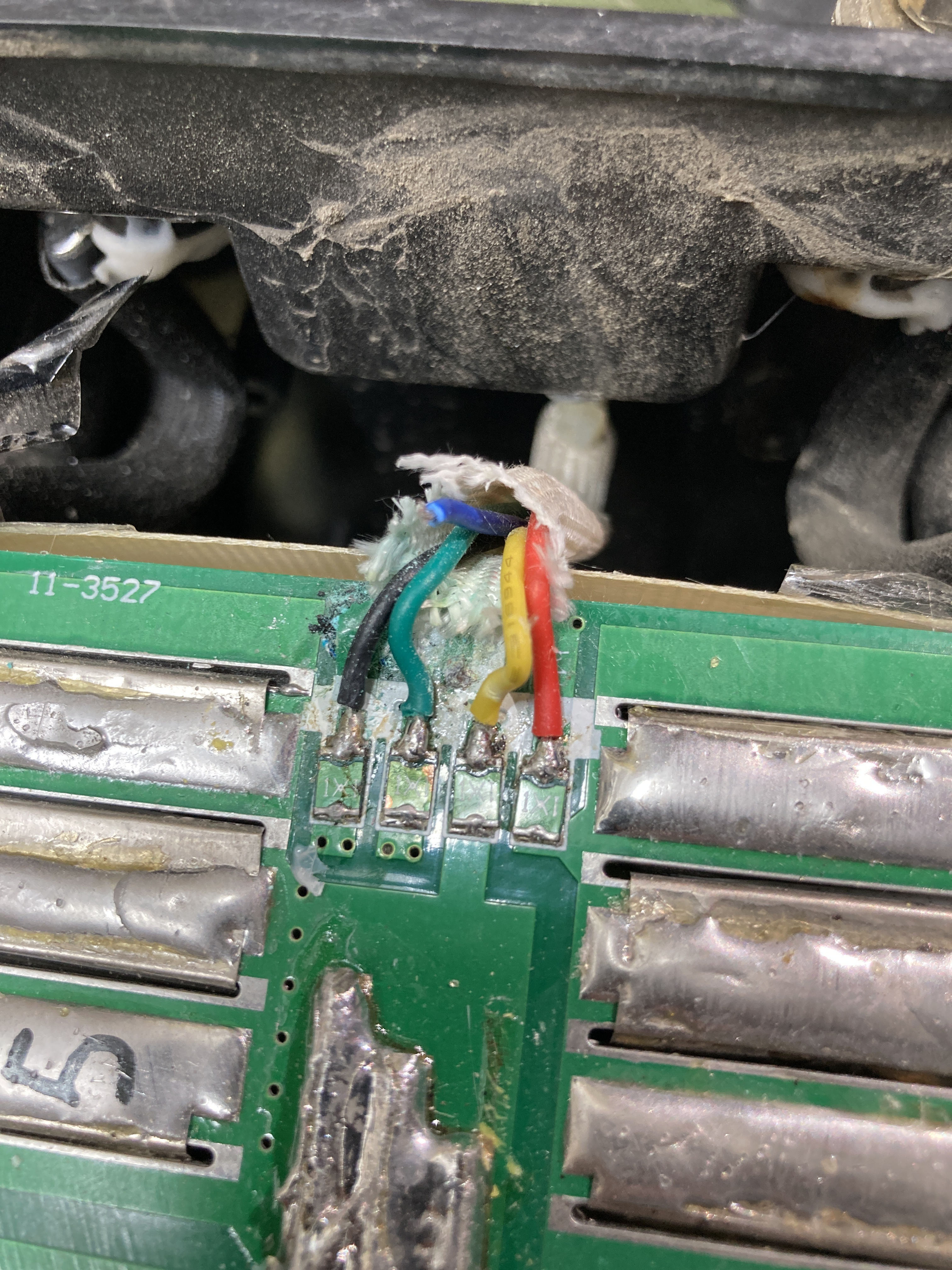 Die Rätsels Lösung lag unter dem weißen Knubbel auf der grünen Platine. Der blaue Draht war ab.