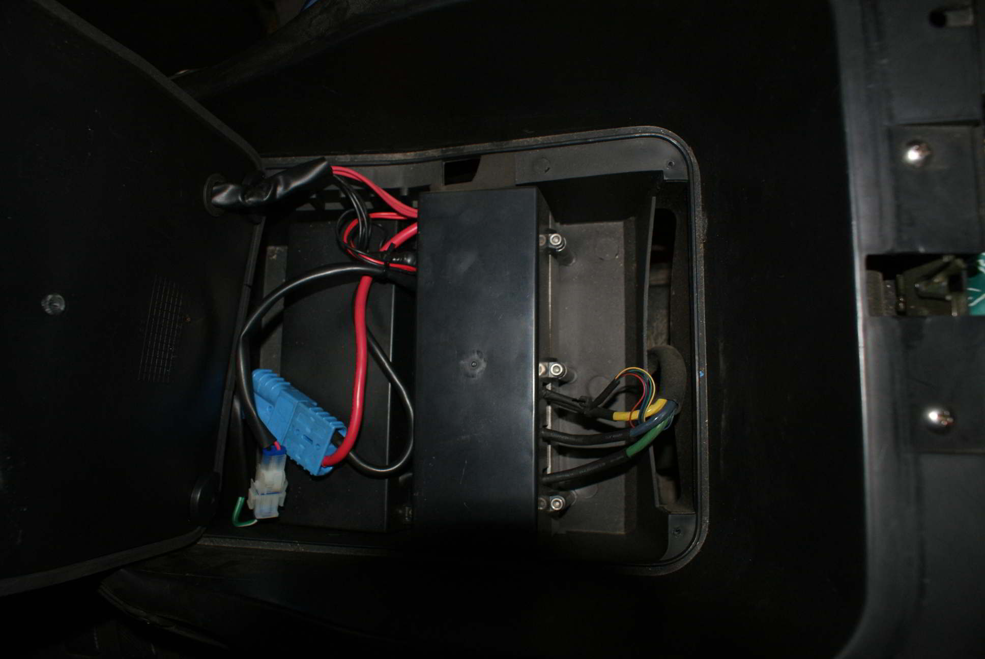 Es sind ein knappes Dutzend E-Max Fahrer der Baujahre 2008(gabs 'mal Rahmenbrüche) bis 2011 hier im Forum unterwegs. Diese E-Maxe haben das MSU (Management Unit System) und den Trapezcontroller unter dem Helmfach und es sieht so aus wie bei Dir auf den Fotos. Der Hauptstromkreis ist mit einer 50A Streifensicherung auf der 1. Batterie abgesichert. Das Ladekabel hat 2 parallele 2,5mm² rote und 2 schwarze auf den 50A Andersonstecker. ( Aufgrund der Querschnittsschwächung gehört eigentlich eine Sicherung in die Ladeleitung, welche direkt mit dem Controller Plus und Minus verbunden ist).