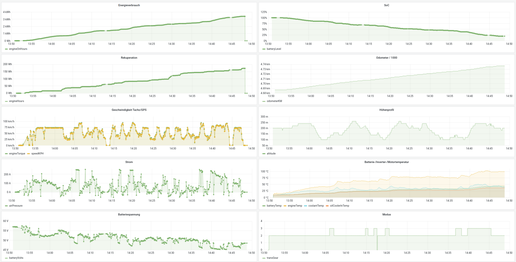 Ich bin gestern etwa 50 km übers Land gefahren, und war dabei die meiste Zeit im City Modus unterwegs. Am Ende des Fahrt hat auch die Warnlampe geleuchtet, da die Motortemperatur auf 103°C angestiegen war. Die beiden Sensoren des Akkus zeigten 36 bzw 43°C und die Invertertemperatur 49°C.