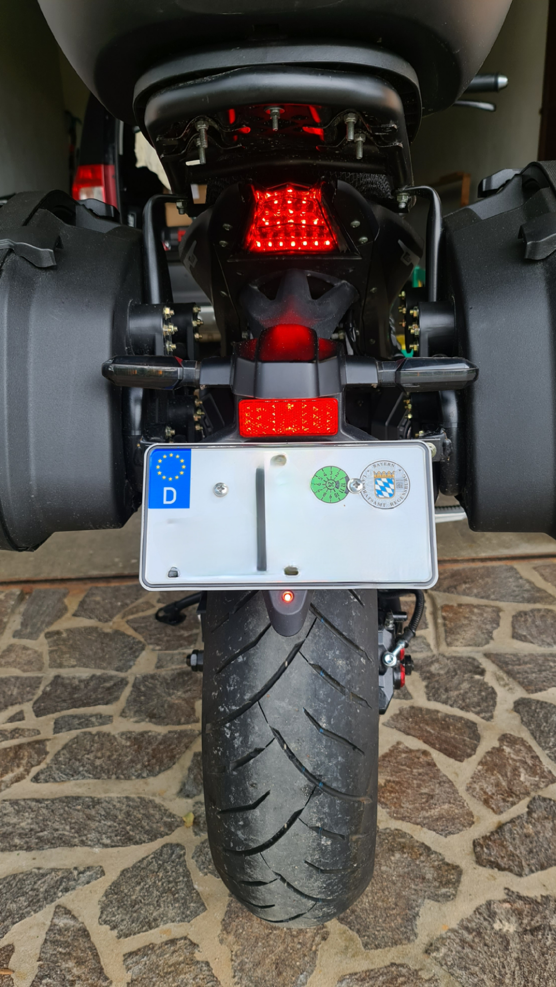 Gestern und heute hatte ich wieder mal etwas Zeit zum basteln an meiner E-Odin 2.0. Ich habe mir ein zusätzliches Bremslicht angebaut, weil das vorhandene wohl nicht so gut am Tag zu erkennen ist und mir fast einer hinten rein gefahren wäre. Ich habe den Reflektor hinten gegen einen mit LED ausgetauscht und auch gleich das offene Loch von der Kennzeichen Halterung mit eine LED versehen. Da mein Scheinwerfer keinen großen Schein wirft, habe ich mir ein Arbeitslicht angebaut, damit ich im Dunkeln bei mir zuhause auf dem Schotterweg besser sehen kann. Seit längerem störte mich schon das mein Topcase bei schlechten Straßen immer klappert. Heute wollte ich mir das mal anschauen, und stellte zum meinem Entsetzen fest, daß sich das Topcase im abgeschlossen Zustand entfernen ließ. Ich habe das Case jetzt angeschraubt und kann somit ihn nicht mehr abnehmen (hatte ich eh noch nie).