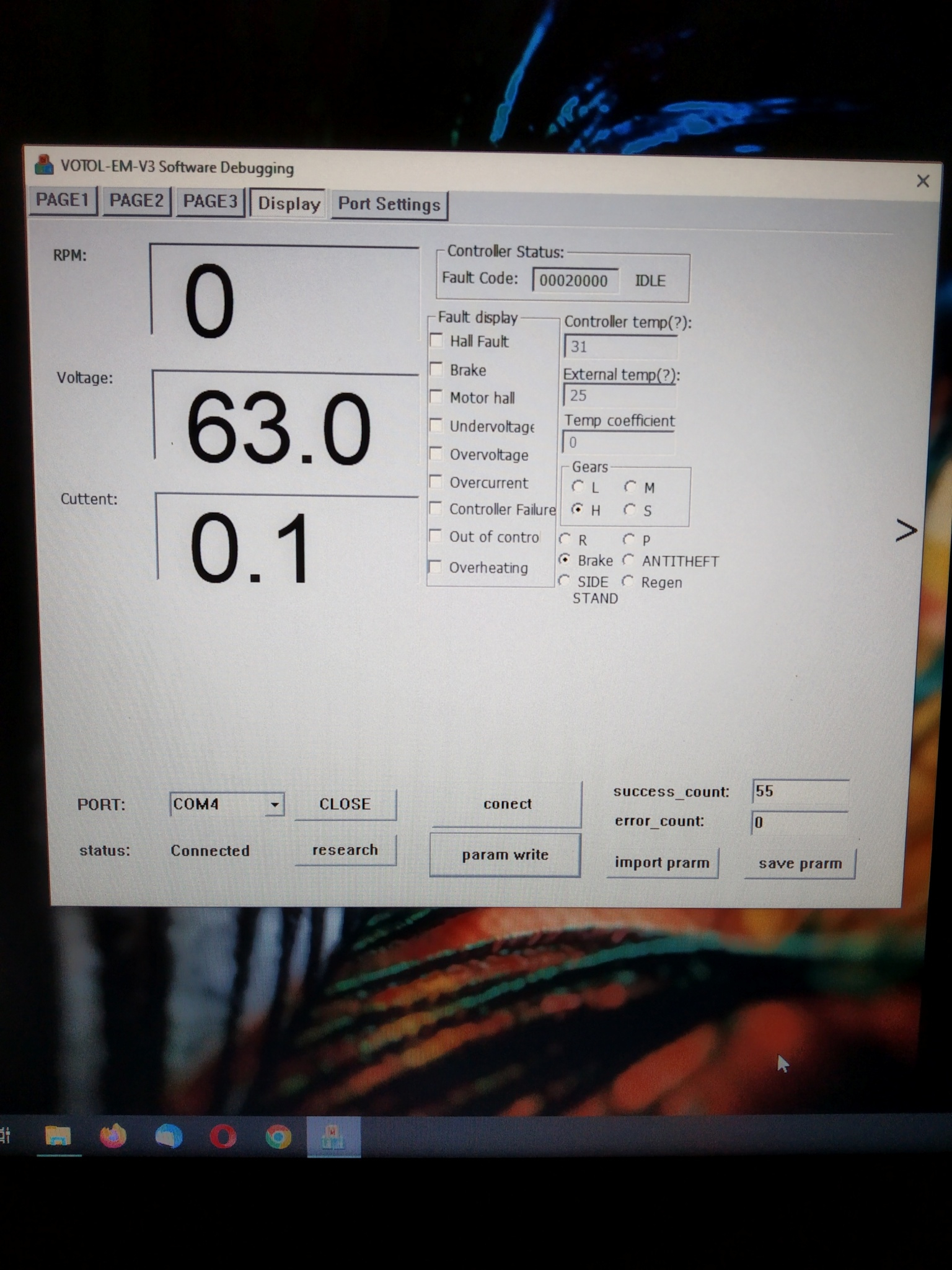 Das Umschalten in den calibration mode (wie in dem YT-Video) habe ich bei gefühlt 1.000 Versuchen in den letzten Monaten zwei mal geschafft, um nach 3 Sekunden wieder Verbindungsabbruch zu haben. Mein Laptop scheint die Umschatung auf die US-Tastatur nicht zu mögen und mein VOTOL mag mich sowieso nicht (vermutlich die Version für Mittelmotoren und nicht die für Nabenmotoren, was beim DUN-shop unterschieden wird).