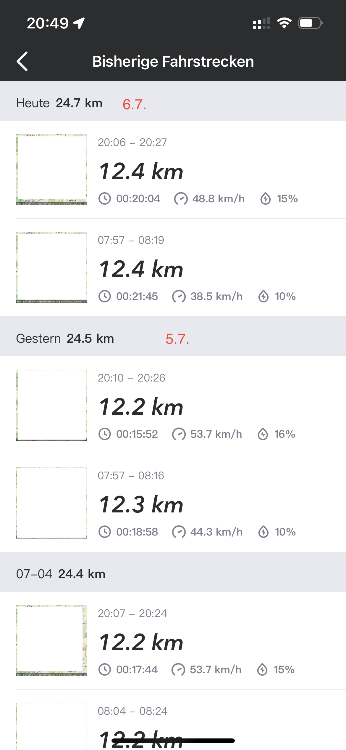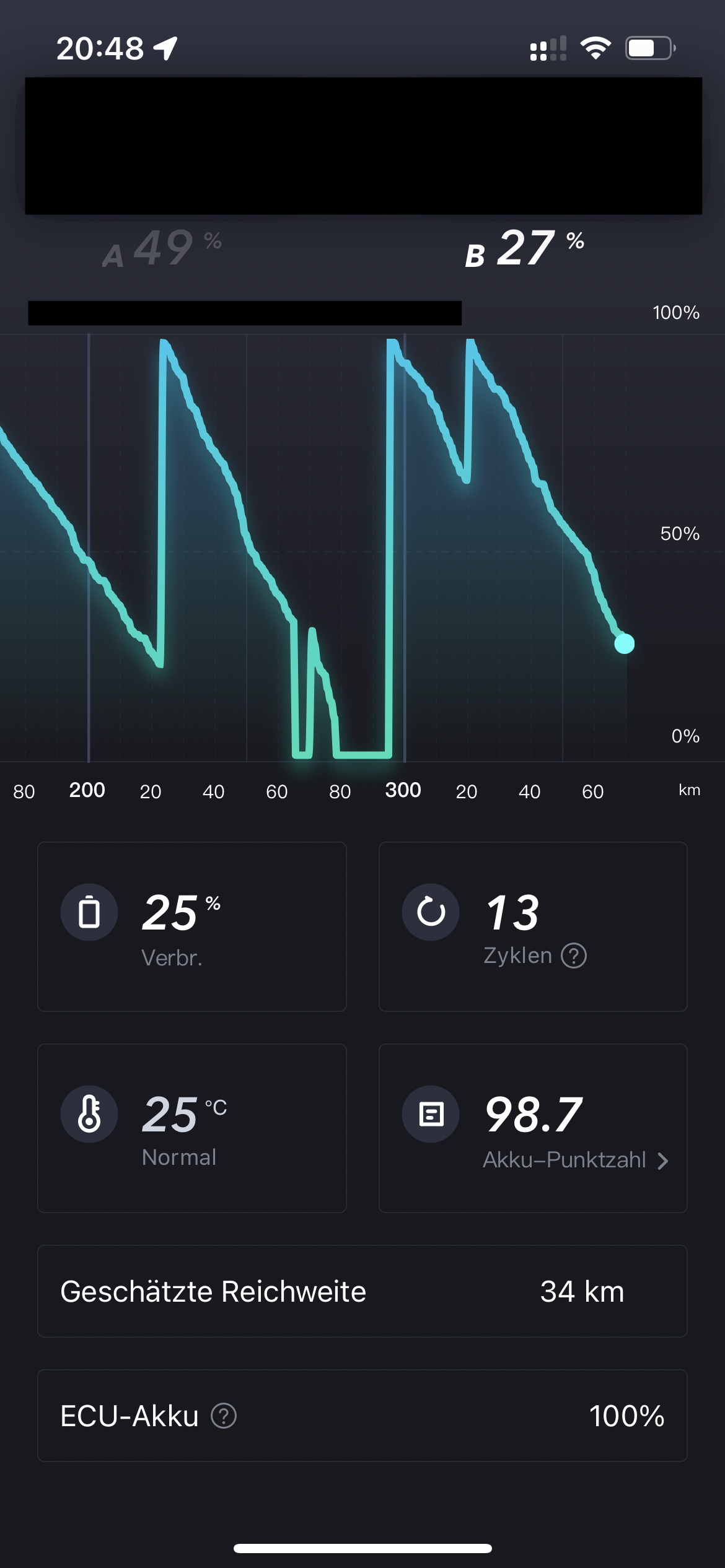 Was ich nun gar nicht mehr nachvollziehen kann abgesehen vom unheimlichen Akkudrift (Der Roller läuft sonst einwandfrei) ist die Restkilometeranzeige. Am 5.7 auf 100% geladen. Laut gefahrener Strecke habe ich an zwei Tagen 51% (5.7 und 6.7) Akkuverbrauch und laut Startbild in der App noch 38% Ladung mit 34km Restreichweite macht zusammen 89%. Wo sind die fehlenden 11% ??