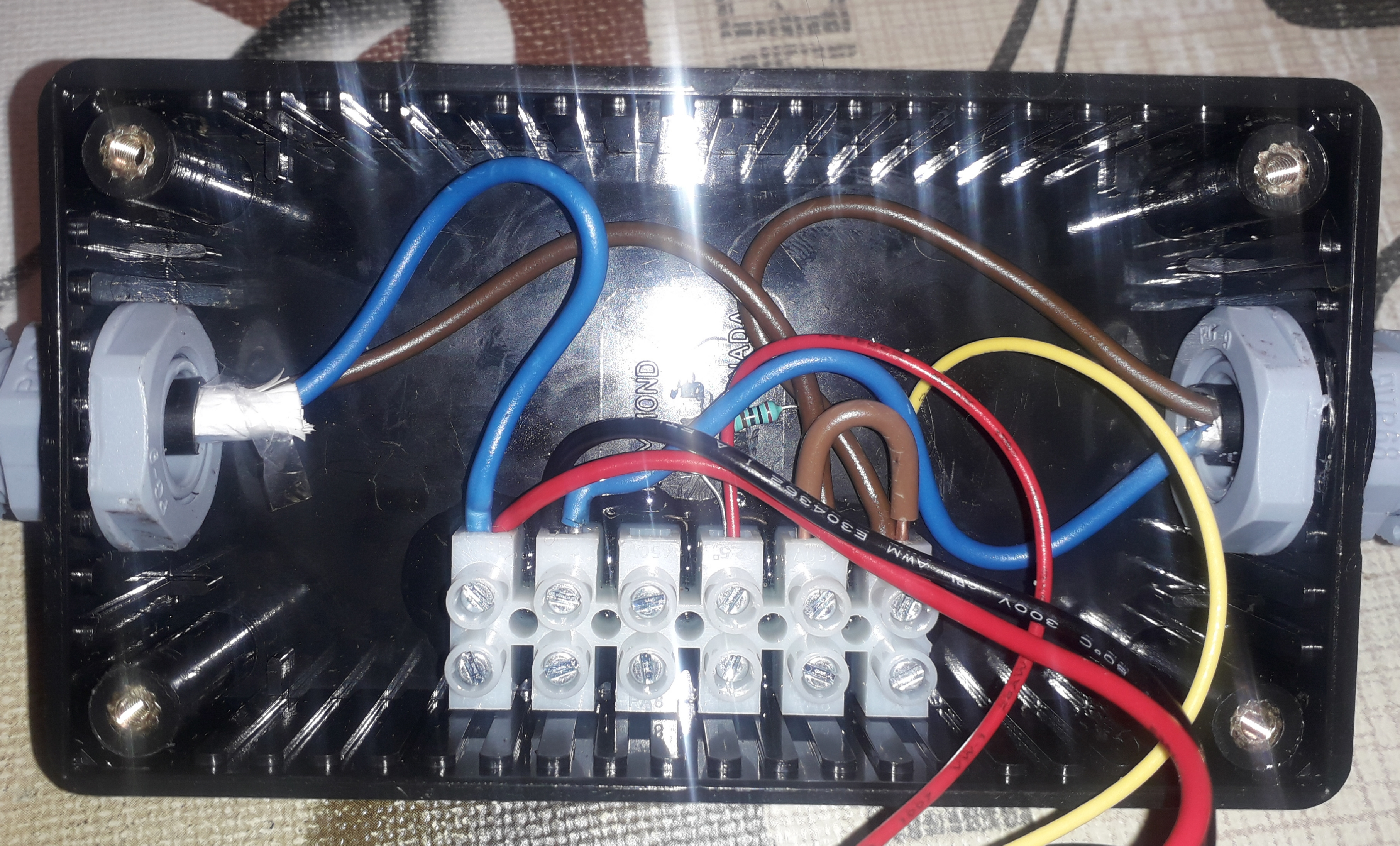 Ich habe das Ladekabel eines meiner Ladegeräte aufgetrennt und das selbst gebastelte Kästchen dazwischen gesetzt.