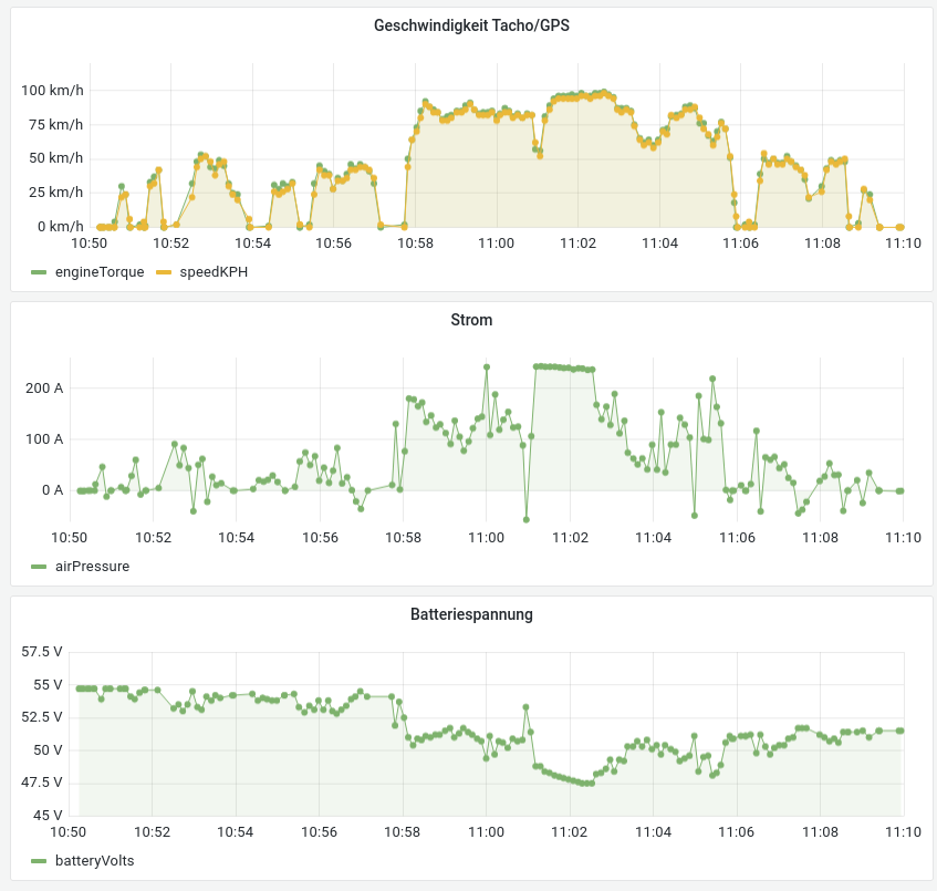 Das "Akkuquälen" bei realem Tempo 100 kann man ganz gut in den folgenden Grafiken erkennen: Aus dem Akku fließen etwa 240A,gleichzeitig bricht die Akkuspannung gehörig ein.