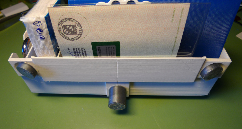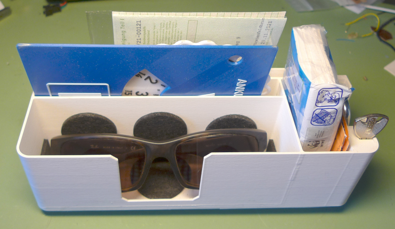 Ich wollte vor allem eine schnell zugreifbare Ablage für Sonnenbrille und Parkscheibe. Was Flexibles mit Reißverschluss wäre nicht so mein Geschmack. Ich habe mir deshalb ein Fach gedruckt, das in der hinteren Hälfte des Helmfachs an die Seite geklebt wird.