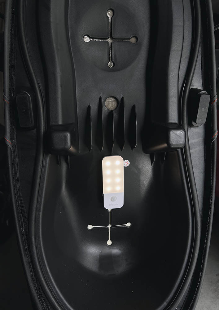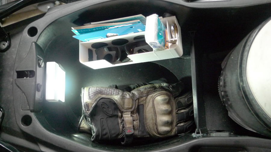 Habe auf Amazon eine passende Beleuchtung (um 7 Eur) für das Helmfach gefunden, welches nur bei Dunkelheit UND Bewegung angeht. Quasi wie eine Schrankbeleuchtung. Zudem kann es manuell an-/ausgeschaltet werden.
