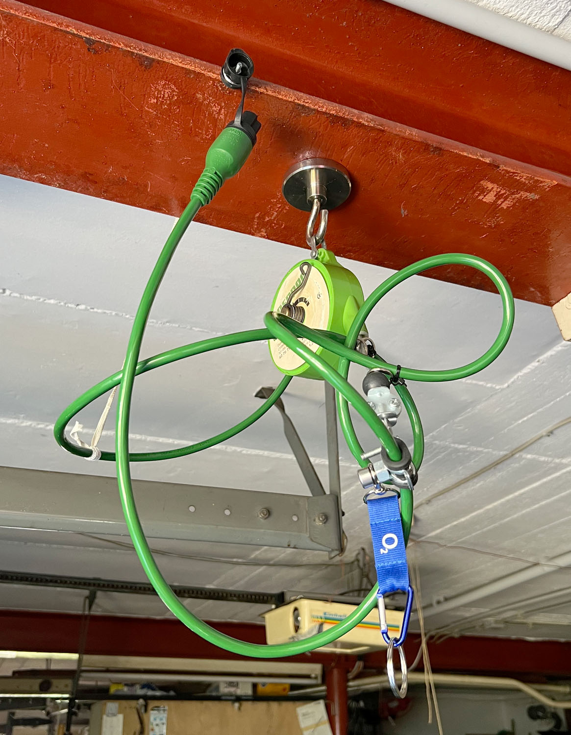 Dass sich das Kabel nicht so verheddert läuft es am Stahlkabel mit drei kleinen Schlüsselringen <> Kabelbinder frei fixiert; das zum herunterhängen tendierende Kabelende wurde mit an der Schutzkappe mit einem Magnet versehen und parkt bei Nichtgebrauch am Träger.