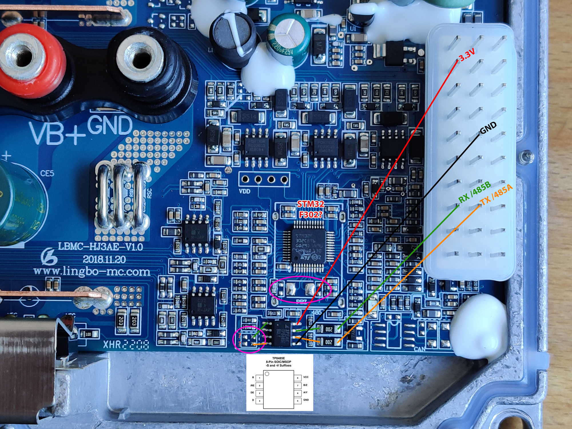 Der RS785 Chip ist verbaut, die Signale (RS485A/RS485B) vom Haupstecker gehen auch rein, aber dann verliert sich das Signal irgendwie (mit den beiden Fragezeichen markiert). In den Kreisen, scheinen ein paar Bauteile zu fehlen. Wenn es nur Widerstände sind, die fehlen kann man diese ja leicht brücken, jedoch muss ich komplett sicher sein bevor ich hier irgendetwas brücke. Vielleicht hilft das ja jemandem weiter, herauszufinden, warum die LBC006.555D keine Verbindung aufbauen können.