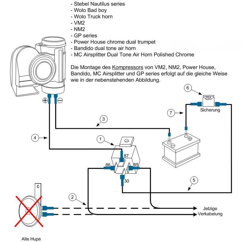 Die Hupe/Stebel wird generell per Relais betätigt: Das Original Hupenkabel ist der Auslöser/Schalter für das Relais; muss man also nur umstecken.