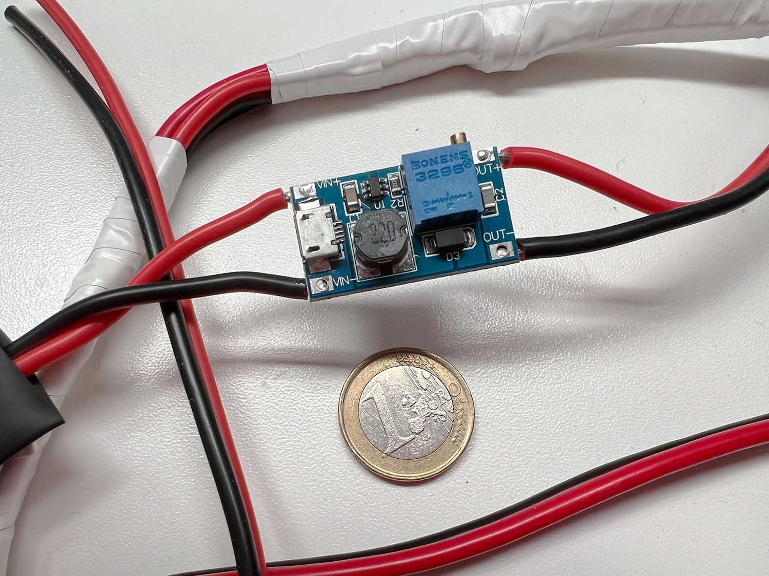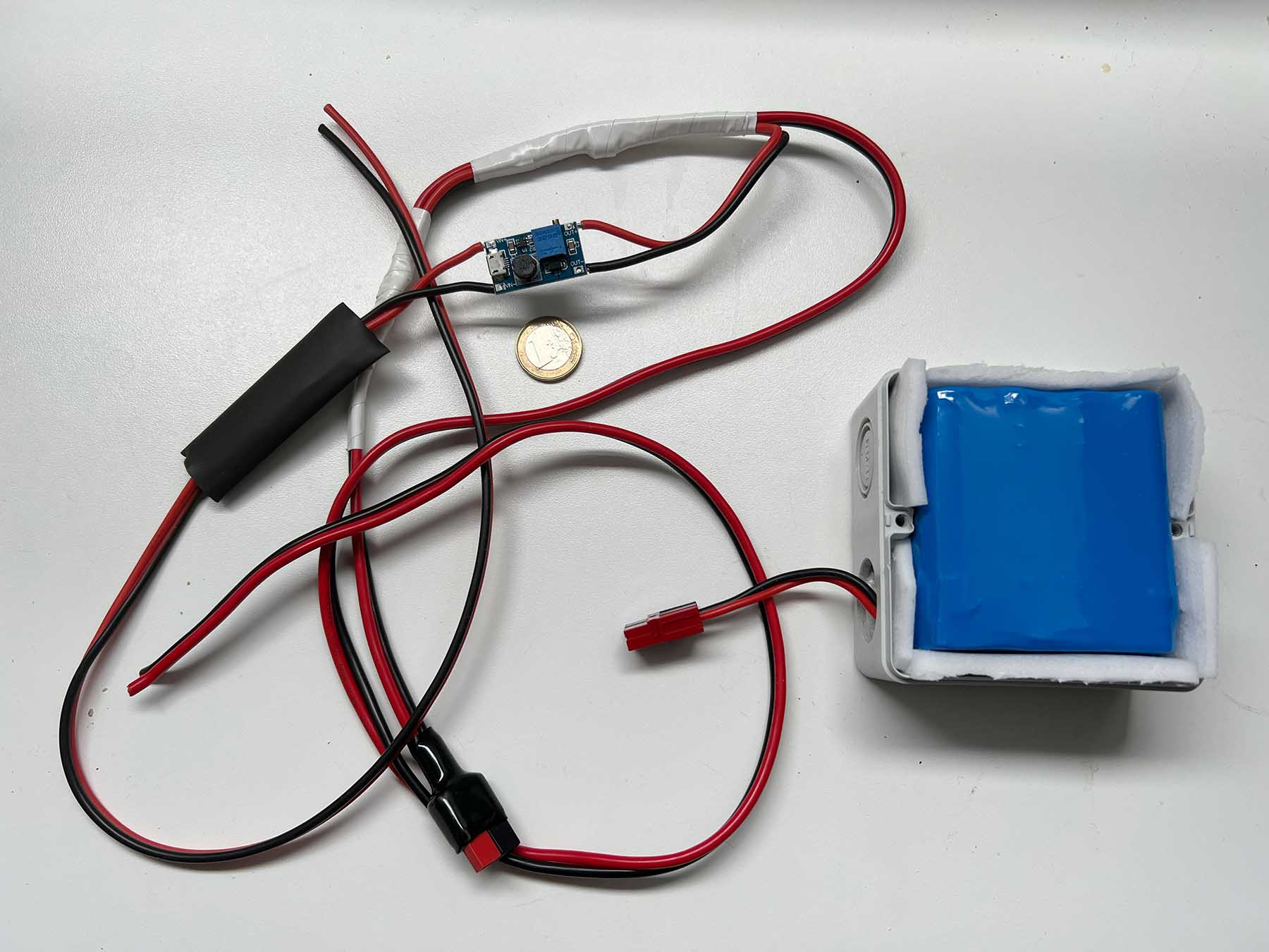 Ich probiere es jetzt nochmal mit dem "kleinen" 12->14V/1A Step Up (eh schon bestellt / muss sowieso zum finalen Anschluss vorne öffnen). Wenn der StepUp auch nicht geht kommt der Akku so rein, mit Ladebuchse wo versteckt, was man alle 1-2 Monate mit ~14V zufüttert.