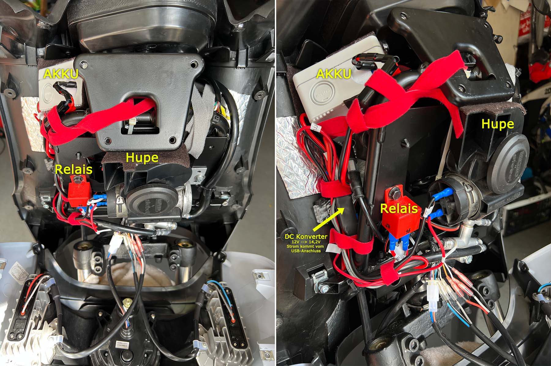 Nicht wundern wegen des komischen Kabelbaums: Dort ist noch eine (Solar) Sperrdiode verbaut (der Buckel im weissen Elektroklebeband), dass der Akku nicht das Bordnetz speist.