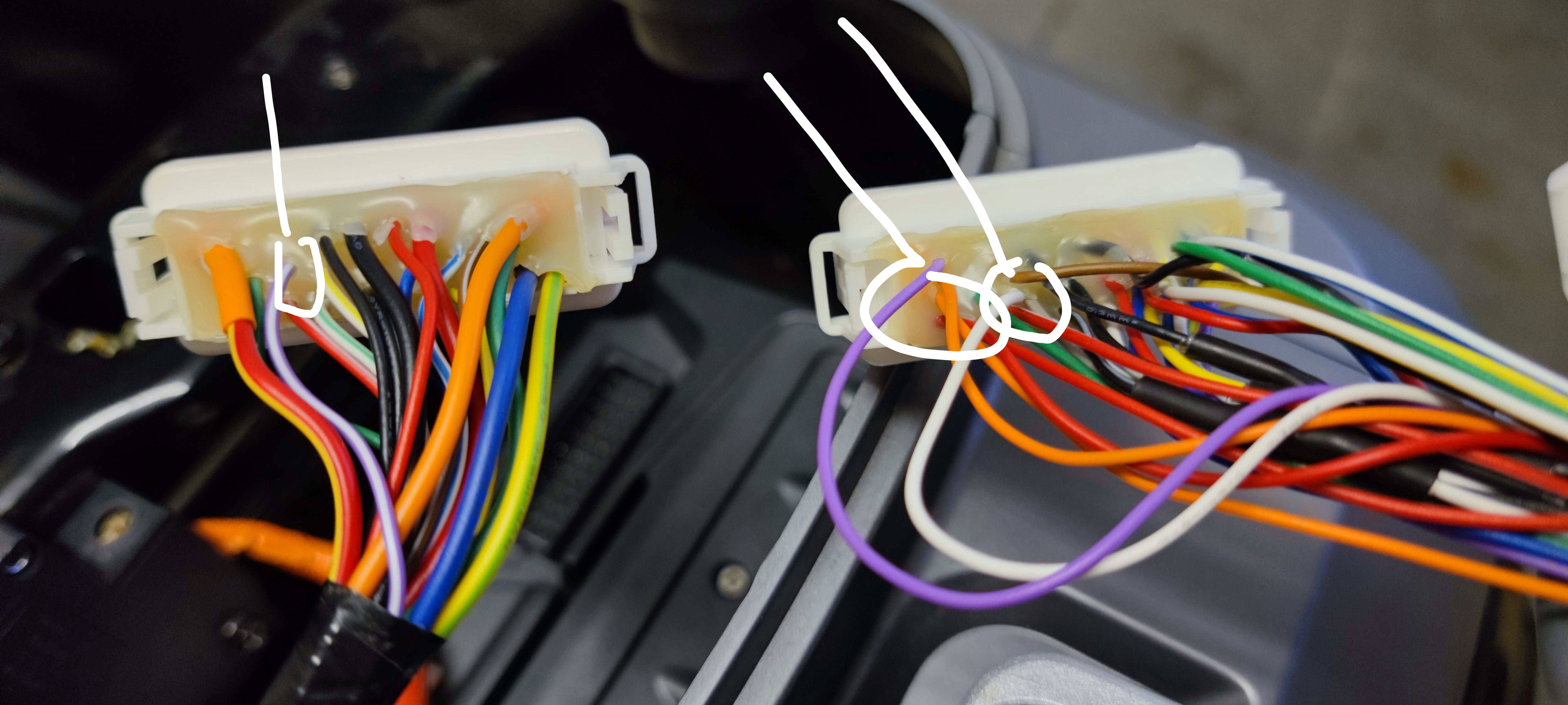 Versuche erstmal die Kabeln Pin Belegung von der Controller auszutauschen. Mir ist aufgefallen das die Pinbelegung zwischen originale Controller und Ersatzcontroller (China) anders belegt sind. Siehe Foto. Laut Hersteller soll weiße Kabel und lila Kabel für die Tachos zuständig sein. Und beim originale Controller sind die beiden Pin Belegung anders. Somit bekommt der Tacho kein Signal von Controller. Daher bleibt Tacho und Kilometerstand immer auf null.