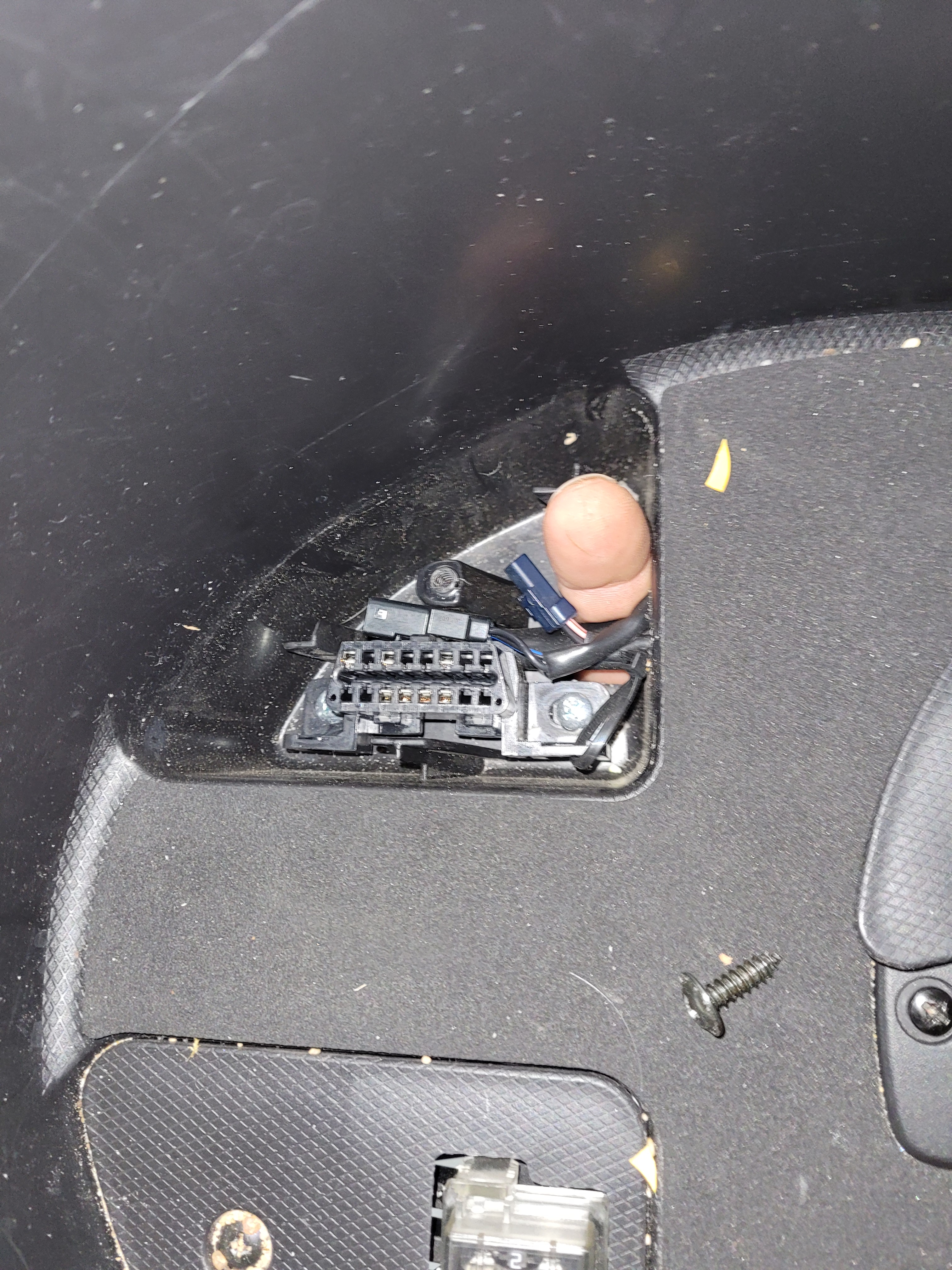 Noch besser aber: es gibt bereits einen Durchgang unter der Abdeckung, wo der OBD-Stecker ist. Siehe Bild, mein Finger steckt gerade drin. Du bräuchtest vermutlich lediglich einen schlankeren Steckverbinder, Dein blauer auf dem Bild könnte da zu mächtig sein. 4mm Goldstecker, wie ihn die Flugmodellbauer hernehmen, würden gut passen.