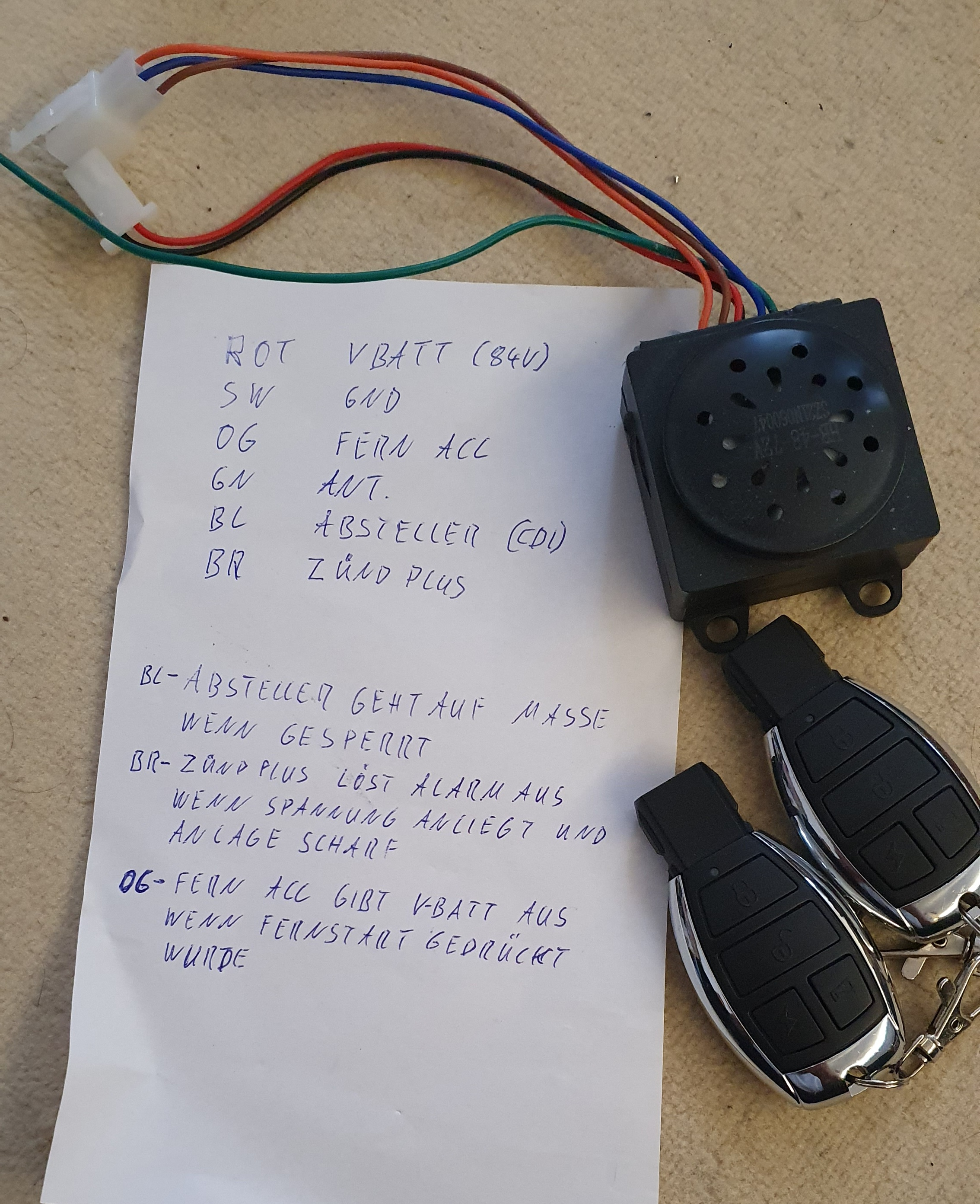 jeff-jordan hat Recht, meine Alarmanlage hat bei jedem Ausschalten quittiert. Ich hab sie dann einfach abgeklemmt. Die Alarmanlage findest Du unter dem Sitz und von ihr gehen zwei Kabelstränge ab. Diese sind mit Steckern verbunden Wenn Du diese trennst, ist himmlische Ruhe ohne weitere Einschränkungen im Fahrbetrieb.jeff-jordan hat geschrieben: Fr 16. Sep 2022, 12:06 Frag mal Hobestatt und Pinky, die haben glaube ich die gleiche Version der Alarmanlage. Siehe dazu früher hier im Thread.