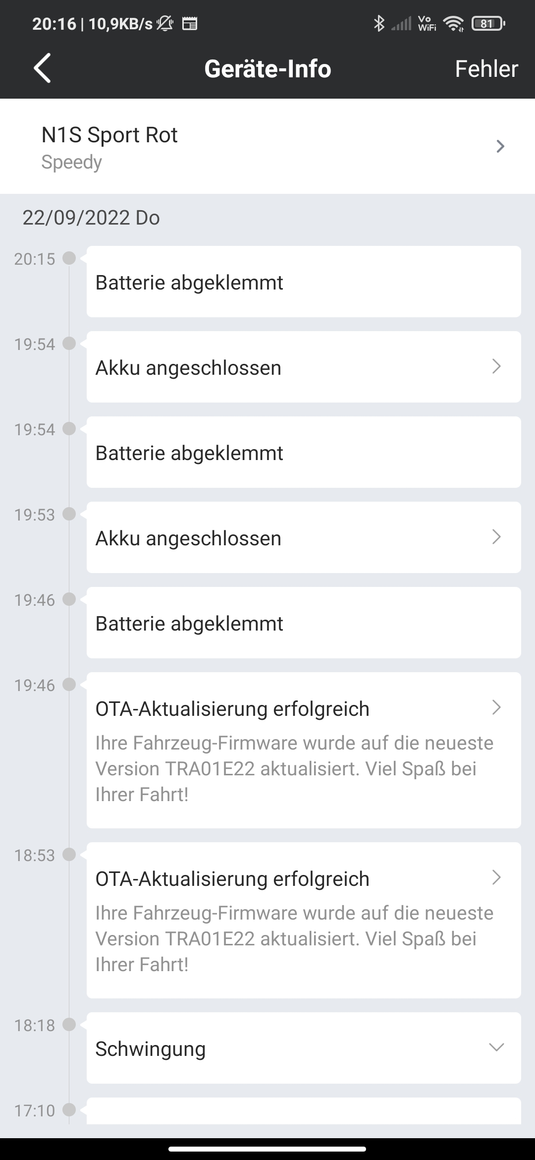 2. Ich verstehe die Alarmanlage irgendwie noch nicht. Die sensivität ist mit der Fernbedienung auf max. eingestellt. Roller abgestellt, lenkradschloss rein, verschließen Taste auf der Fernbedienung gedrückt. Hab dann den Roller mal mit lenkradschloss drin 2m geschoben. In der App gab's die Info "Schwingung erkannt", der Roller machte keinen alarm, das wars. Da müsste doch mehr sein?