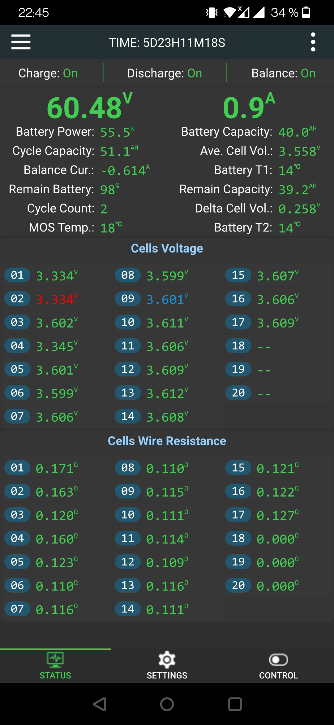 Leider hat das JK BMS zu wenig Zeit gehabt, alle Zellen auf einen Level zu bringen. Früher begann man eine Neuinstallation mit einer Initialladung. D.h. alle 17 Zellen parallel schalten und mit 3,65V laden, was wenige Tage dauern konnte.... Auch morgen Früh werden die Zellen 1 + 2 noch hinterher hängen, leider.