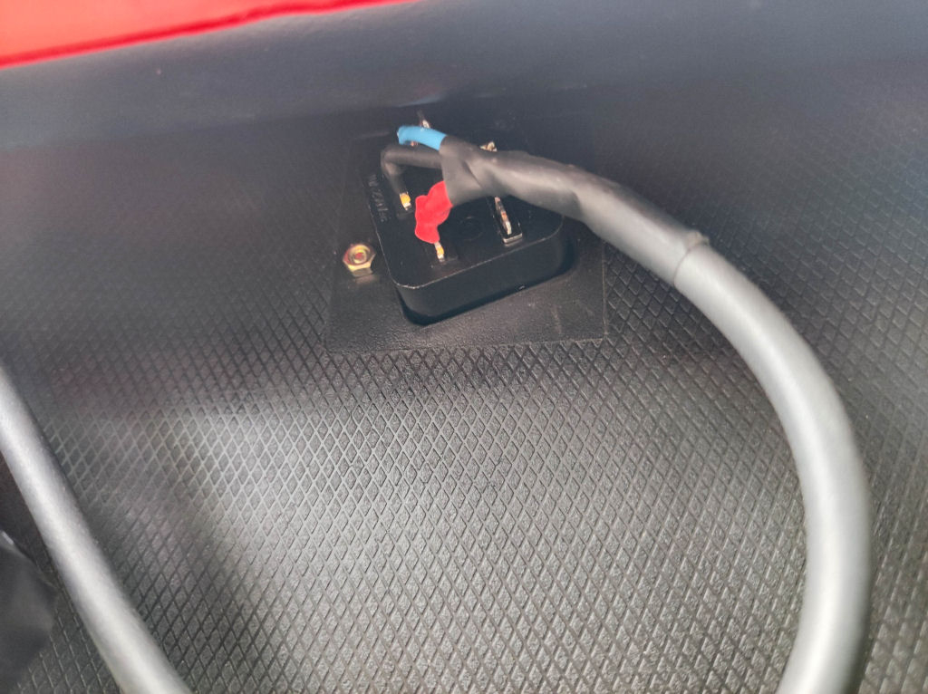 Zwischen Trägerrohr und Rückseite meiner Konstruktion sind jetzt ein paar Millimeter Platz, nichts drückt. Das Kabel ist etwas länger als im Original (ca 30 cm), geht nach oben weg und in einer Schleife dann an den eigentlichen Anschluss. Ich habe zunächst das Anschlusskabel durchgeführt (Buchse noch im Innenraum), dann die Wanne angehoben, Kabel aus den Kabelbindern am Rahmen gelöst und zusammengesteckt und wieder verstaut, Wanne wieder eingebaut, zuletzt den Klotz durchs Loch gefädelt und angeschraubt (mit Zeugs was die Bastelkiste hergab, man kommt mit den Fingern noch hervorragend dran. Endergebnis:
