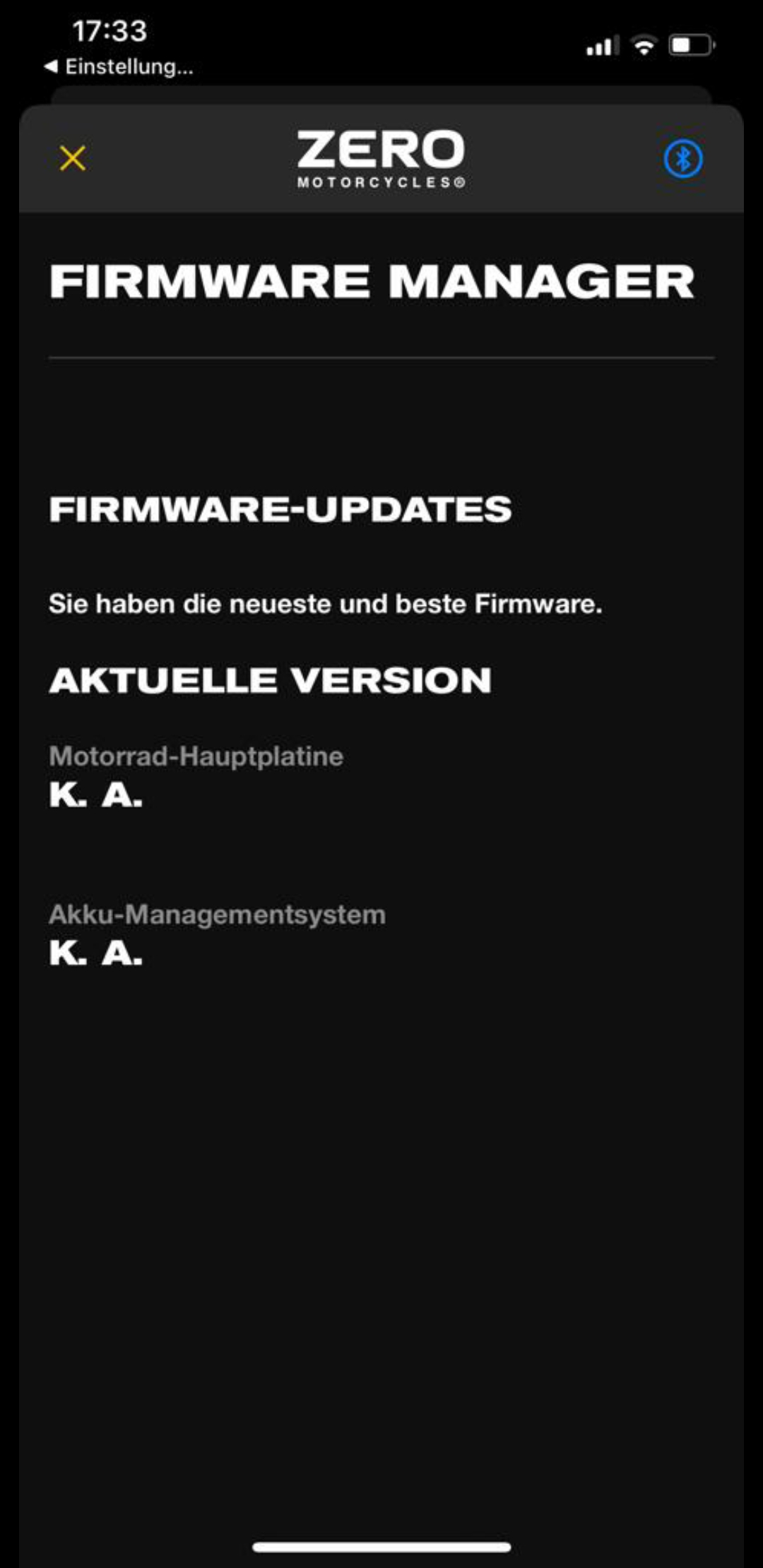 Dein Telephon ist nicht mit der Zero verbunden. Die App kann die Daten nur anzeigen, wenn gleichzeitig auch das Motorrad per Bluetooth verbunden ist. . .