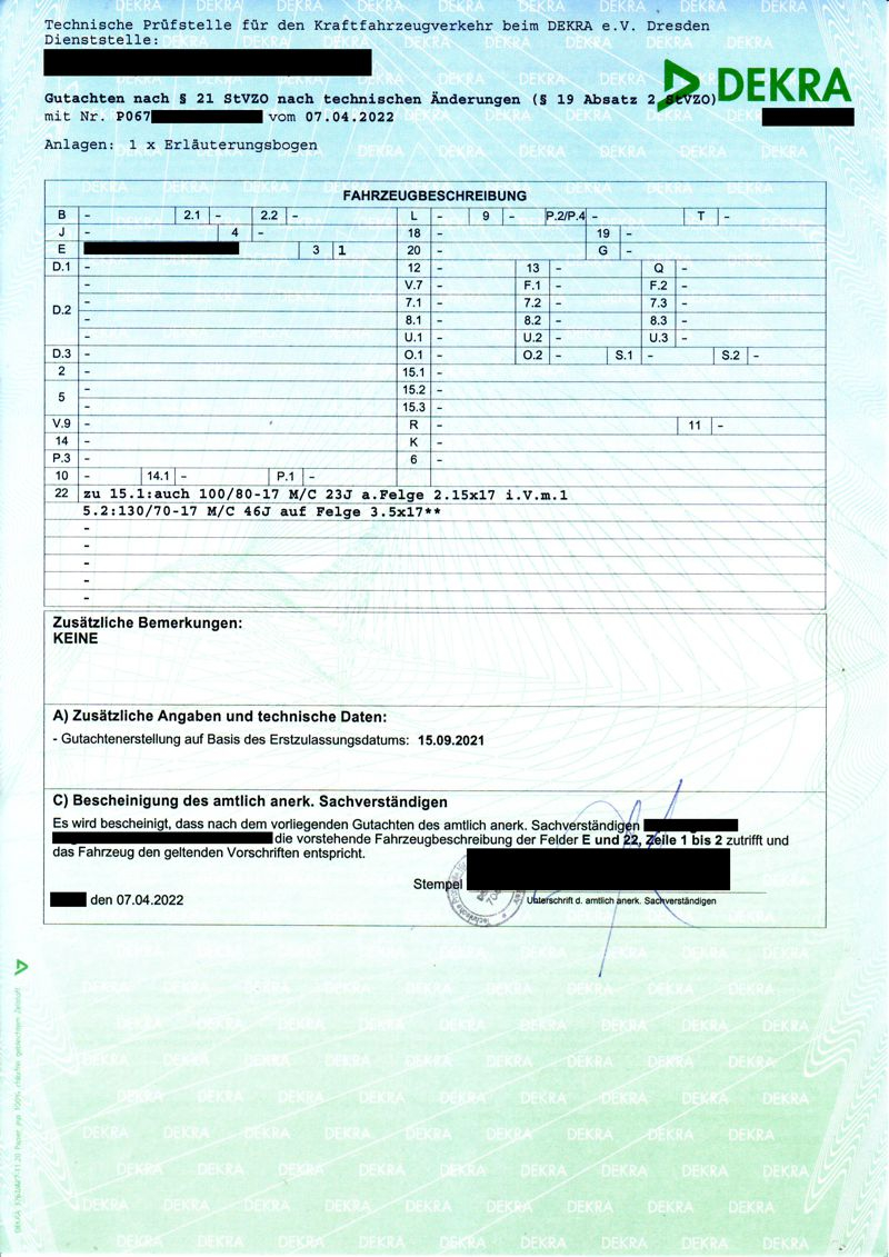 Falls jemand auch diesen Reifenquerschnitt eintragen lassen möchte, so sieht das Gutachten aus: